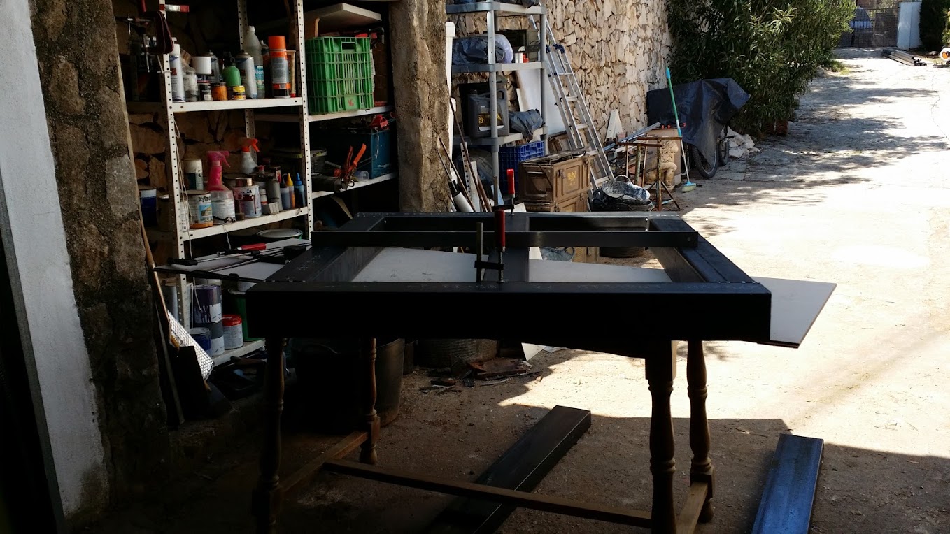 So as all was mounted together maintaining that precision i laid it down carefully on top of the back Z plate. Now as you can guess the Z plate was not perfectly flat. So i spot welded the side plates/together with the aluminum assembly/ to the Z plate, but only at one side that so the previous assembly is square left right. See pictures above. I used also some clamps not to let it twist left right. Then i force clamped all down to the steel back Z plate , so now it was square and flat / cause the steel side plates wer cut by laser 0.01mm , remember? and i have mounted them perfectly flat against flat plate/ .