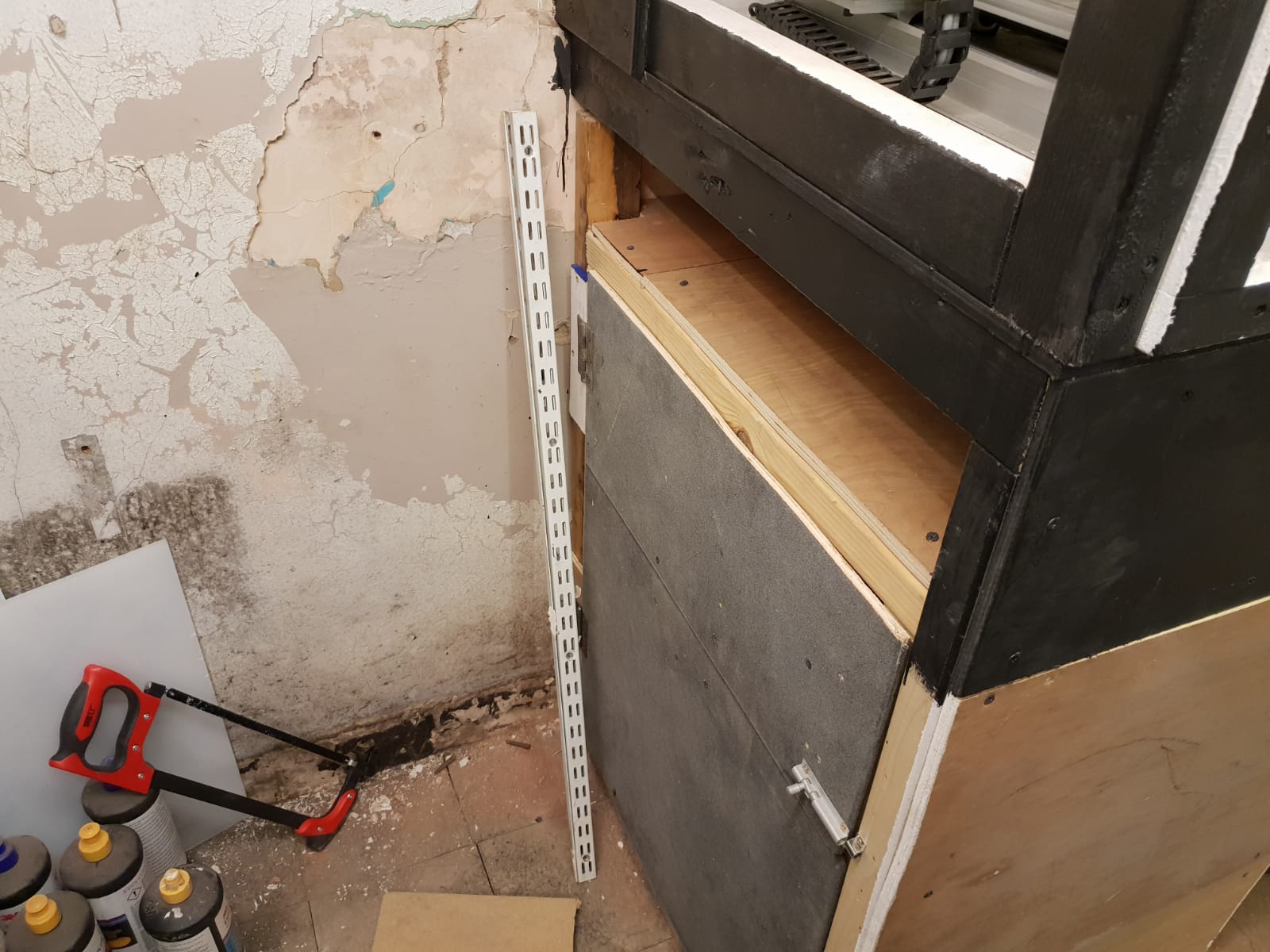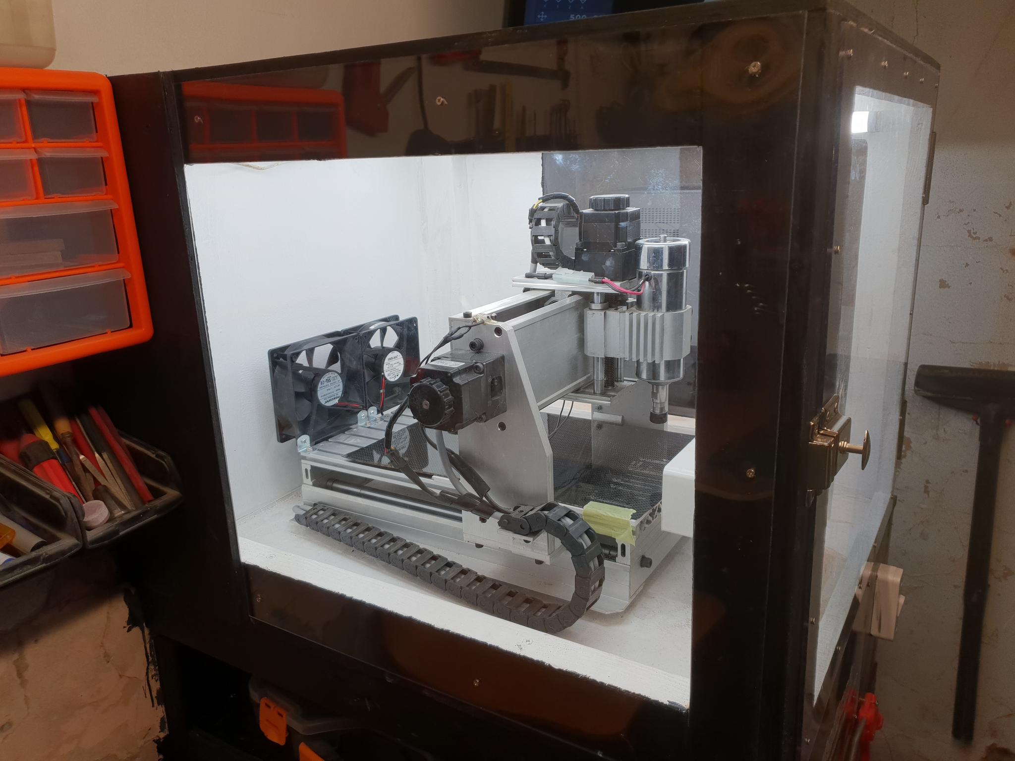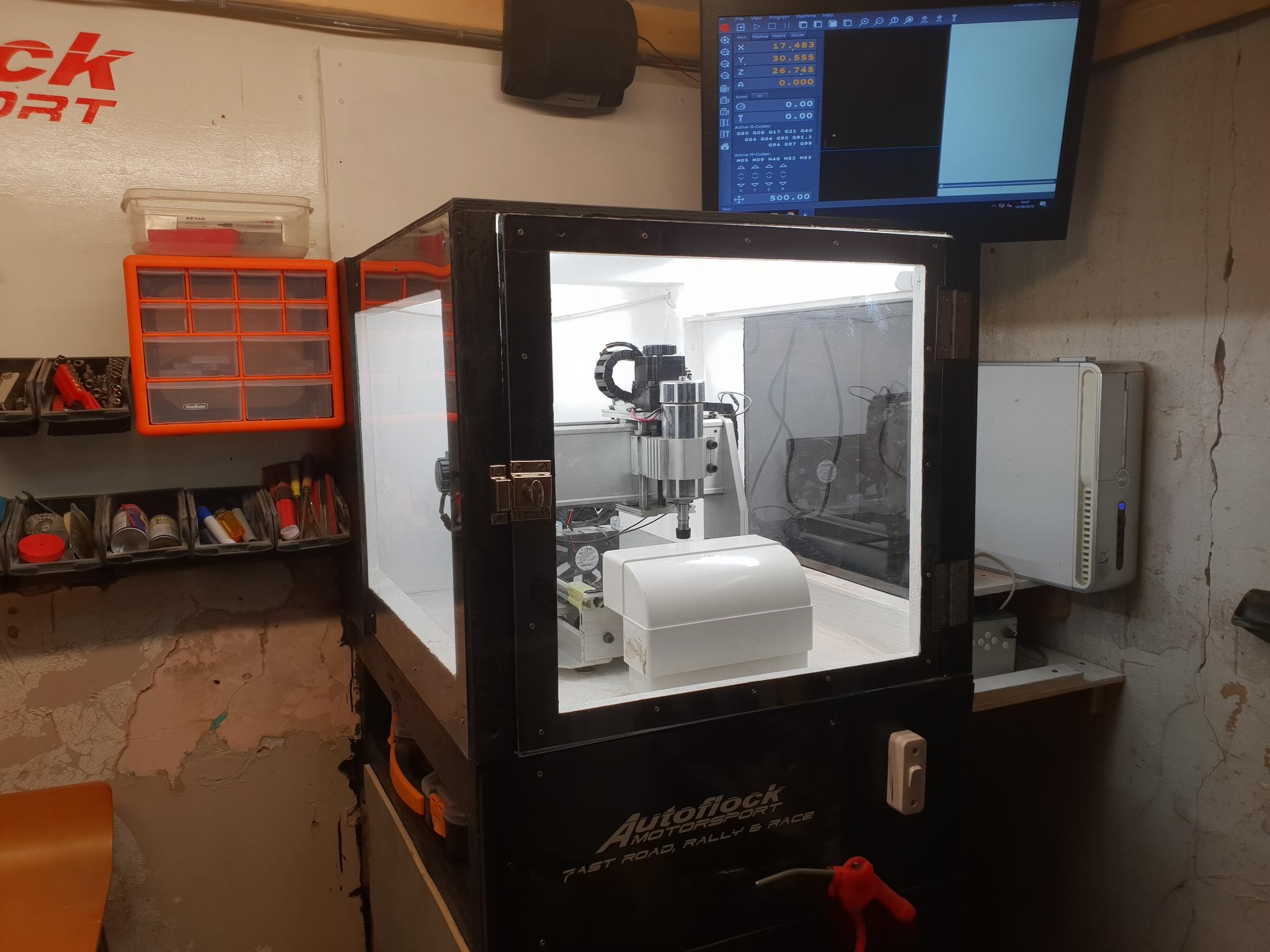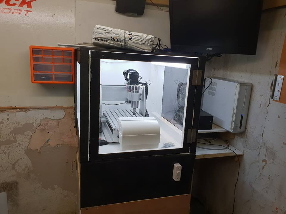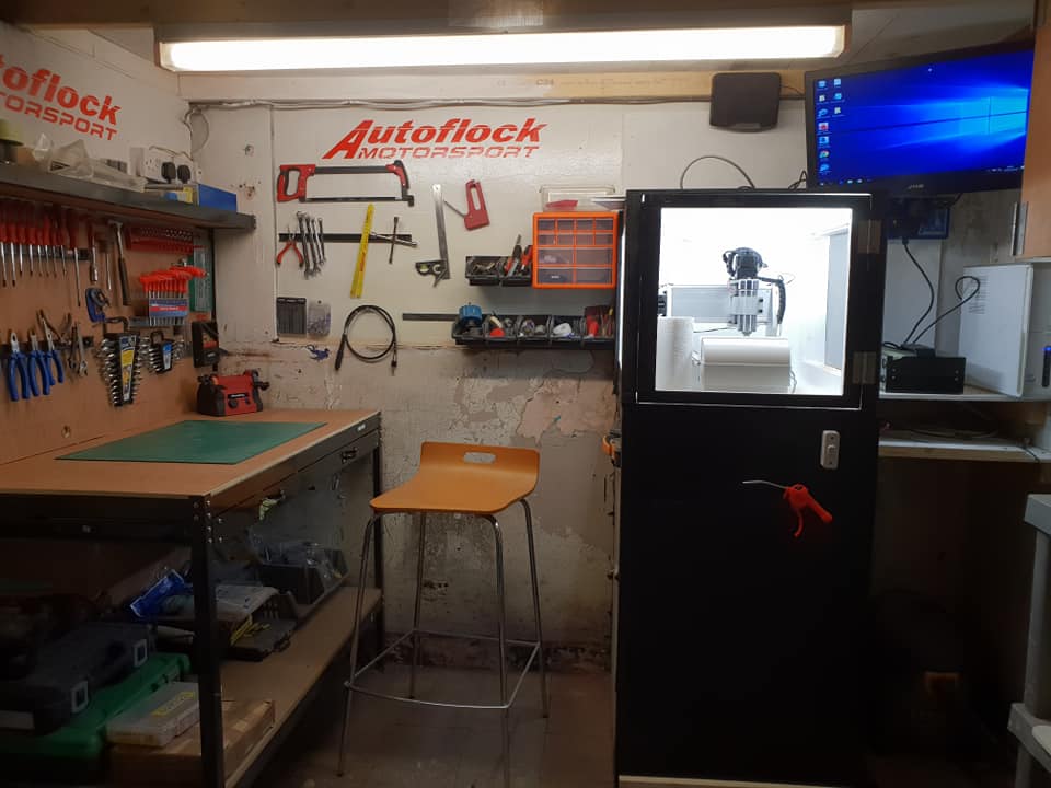 And here is how my setup has finished off with the enclosure fully panelled with perspec and a latch on the front door, only thing left is to swop the desktop pc with a docking station for my small laptop, just need to swop and register all the software im using, im pretty happy with the setup, would like to hear your thoughts on what you lot think. Its only a small workshop so I have tried to be as efficient with space as possible.