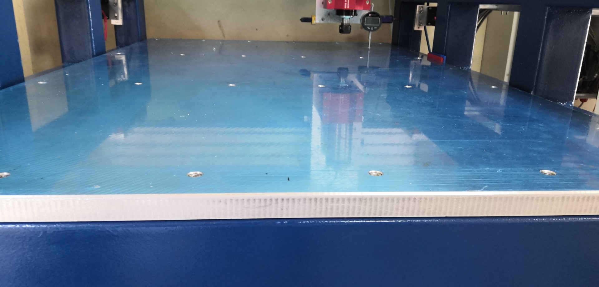 The covering is tight and uniform so I think I can trust them enough, I DTI'd the milled shims first which was zero everywhere, happy that my +/- 0.01mm on the top is a mixture of error from the covering and the plate itself. Anyway doesn't need to be perfect as the spoil board will take up any error, if I need a very flat part for bolting a vice to I will skim the aluminium bed, I left the bolt heads low enough to do this.