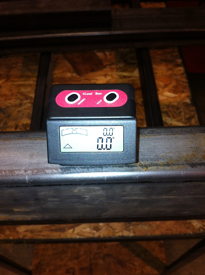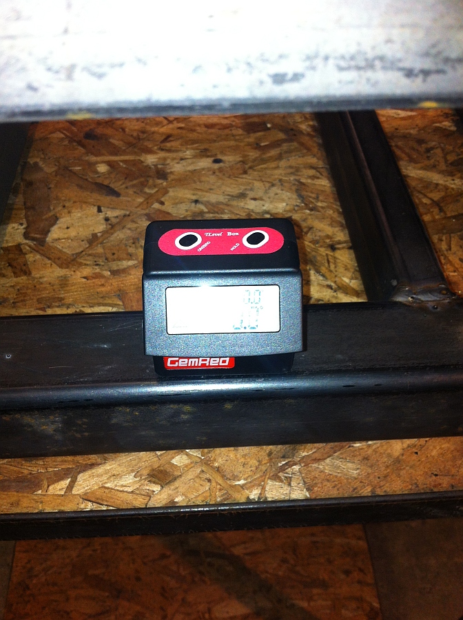 Well after being off sick with stomach cramps for the last 3 days I got into the workshop at lunch to weld the second side rail on and start tidying up the welds. I am quite pleased with the accuracy I got (hopefully) on the rails according to my level box. I referenced the first side rail from the base frame and then using the level I clamped the second rail and referenced that from the base frame front and then kept tapping the rail down with a soft face mallet until it was showing 0.0 & 0.0 all the way from the front to the back. I checked the level again before tacking the rail in place and then checked it again before doing the final welds. I'm still going to epoxy level the rails I think...