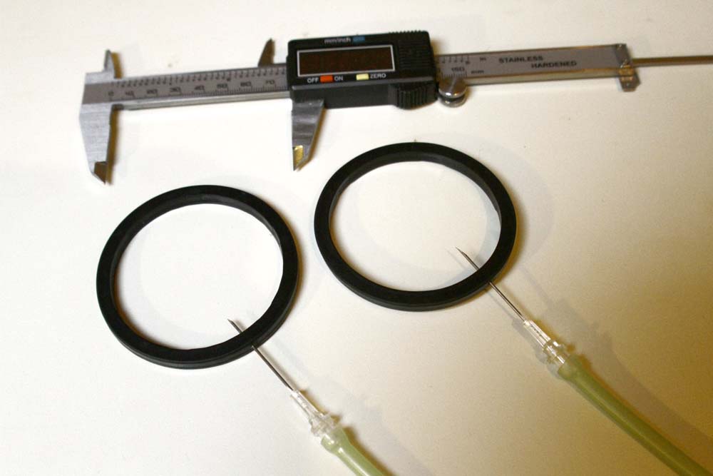 1mm outside diameter hypodermic needles, i drilled the seals with a .75mm drill (by hand)