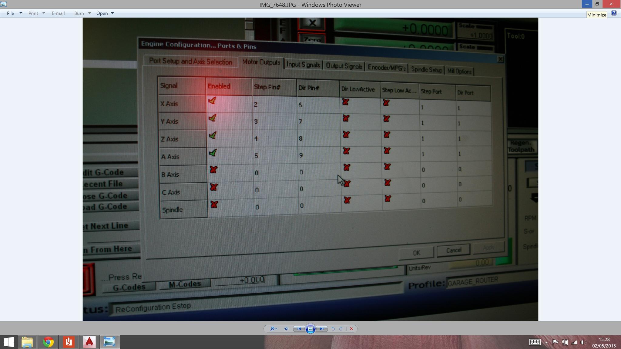 the manual for the drives allows me to auto configure the motors by switching SW4 twice in 1 second but i can only do this if i have the signals for the drives unpluged. when they are unpluged the motors go into a holding state i.e. they are powered.i have the drive enables wired directly to the bob enable inputs, when i disconnect them i can hear the motors humming and they are locked/held. sorry for the delay , i'm using a p.c. with no internet, paint , office , . i have it dedicated for MACH3 so i had to transfer files to my laptop. http://www.mycncuk.com/attachment.ph...id=15242&stc=1http://www.mycncuk.com/attachment.ph...id=15243&stc=1