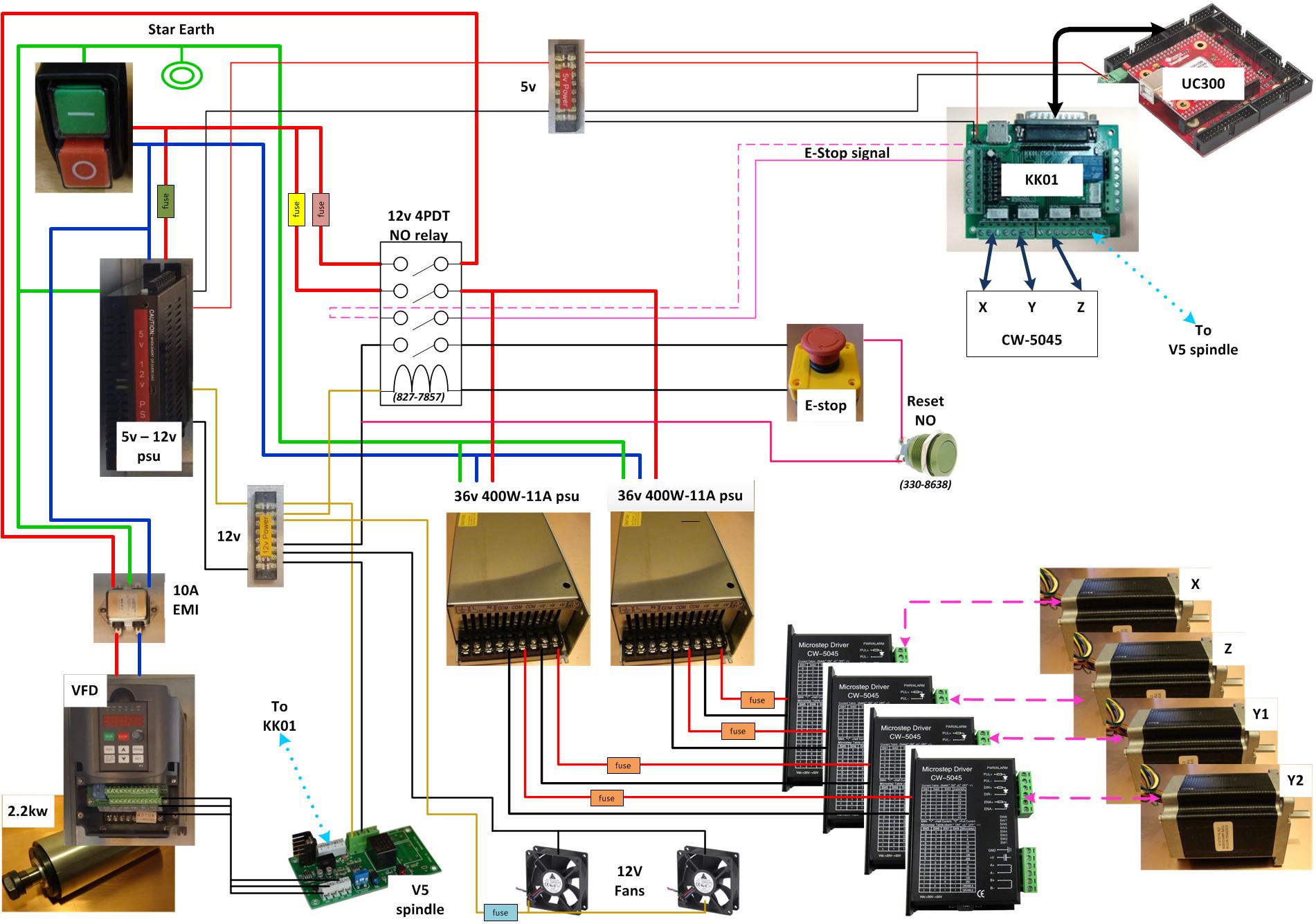 However going by the latest wiring diagram, you'll struggle to get a relay capable of the required current with 5 contacts. The VFD will draw 8 amps at full power, and along with the stepper PSUs, there will also be a surge during power up.