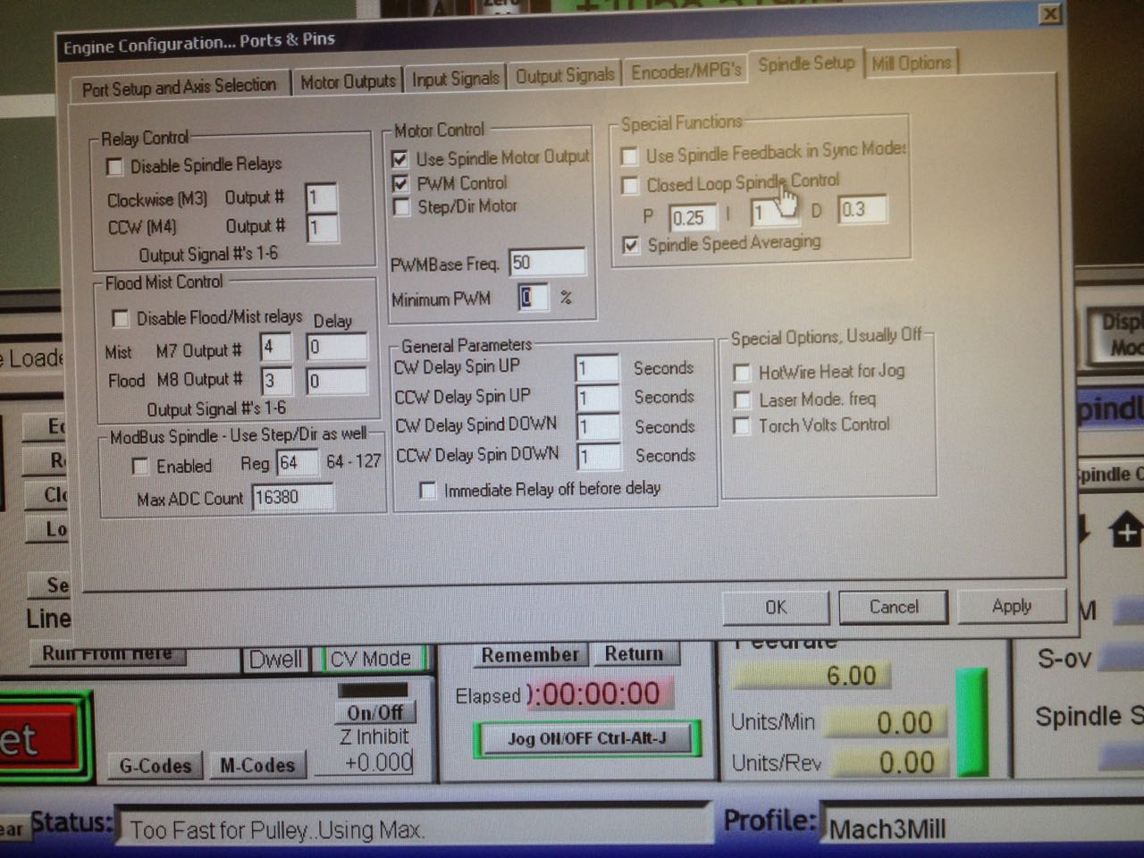 I've had a good fiddle about with the settings on Mach3 this afternoon and found that setting PWM to 50hz (see pic) gets maximum frequency from the inverter (I'm surmising that means 10v from the BOB, but have to admit that I've not put a meter across it). I've also gone through pulley settings too and have calibrated the spindle to within 50 or 60rpm - which seems good to me. I note however that ramping down the spindle in Mach3 from 100% in 10% steps that the frequency at the inverter was out by 1-1.5hz. So at 50hz I'm actually getting 49.2 or so, again well withing tolerance as far as I'm concerned.