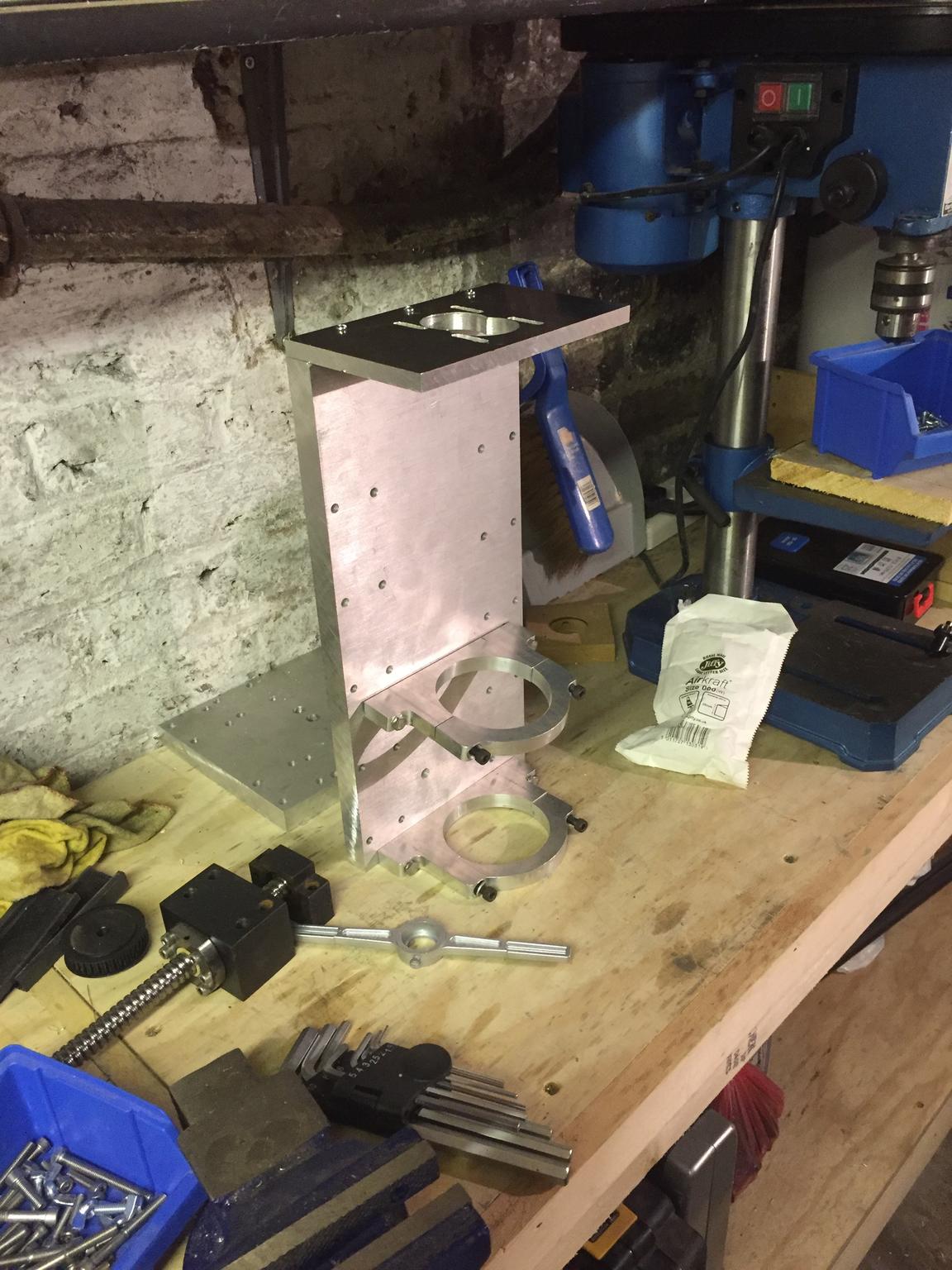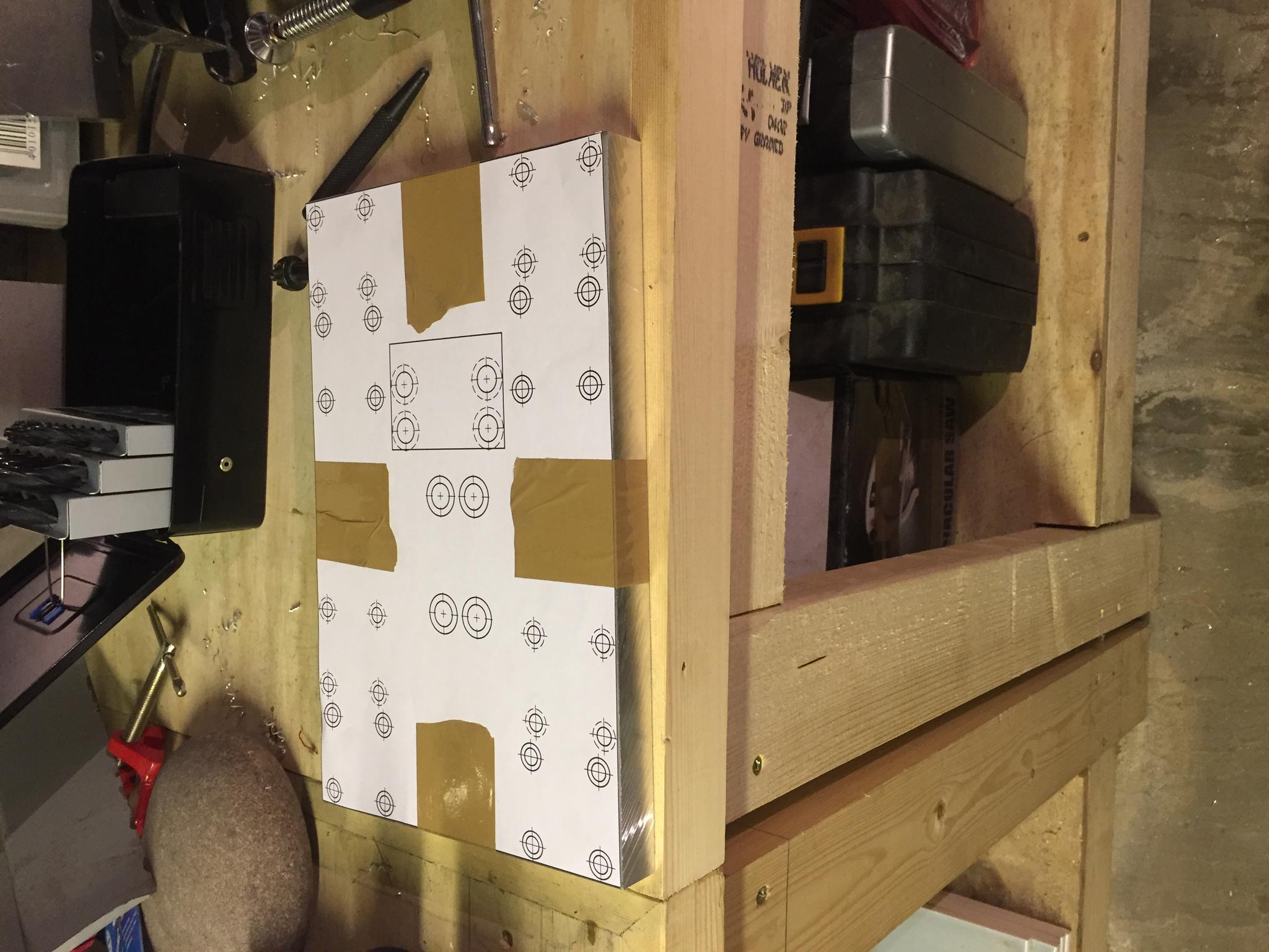 Started construction of the Z axis front and rear plates. Armed with a hammer a center punch, a set of hss drill bits and a few counterbore bits off ebay and my trusty Clarke Bench drill this is the outcome.
