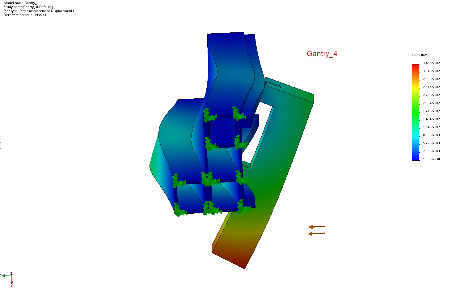With this larger "L" the displacement metric goes from 0.040mm to 0.034mm. My gains in stiffness are getting less and less now. The interesting thing here is that there is a more equal distortion level on the top and bottom of the gantry. A well designed mechanism will show a more distributed deformation than one with very high and low distortion areas. This suggests to me that I am approaching the limit of improvements in this configuration. This configuration is probably OK as far as it goes.