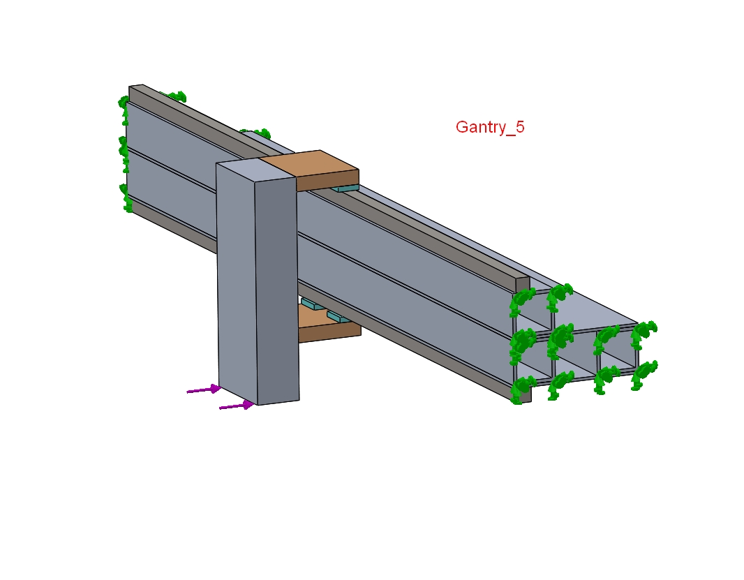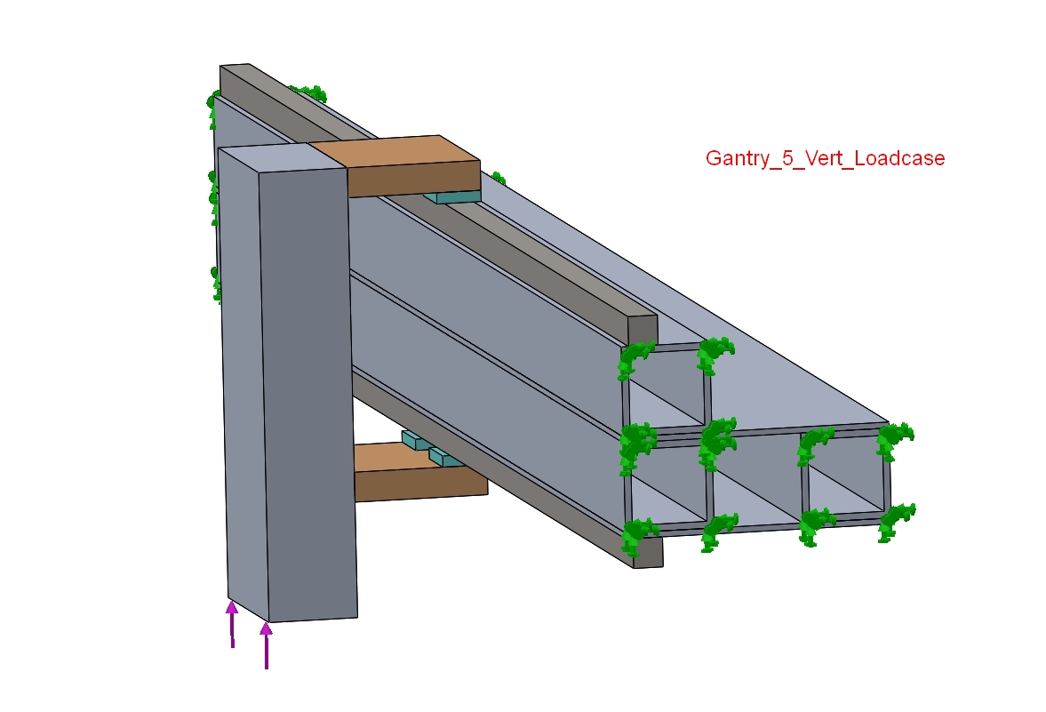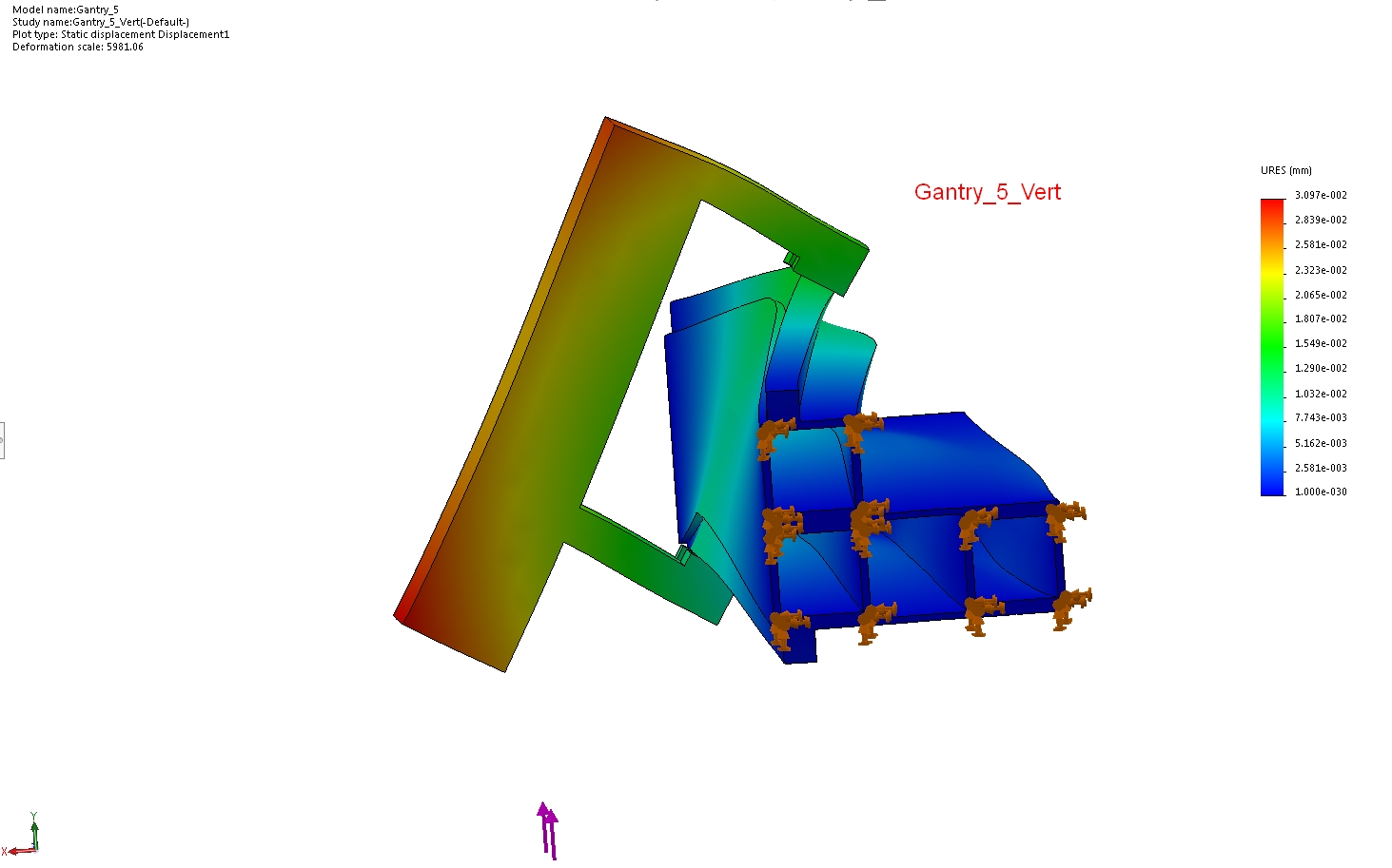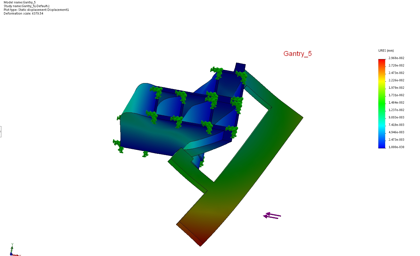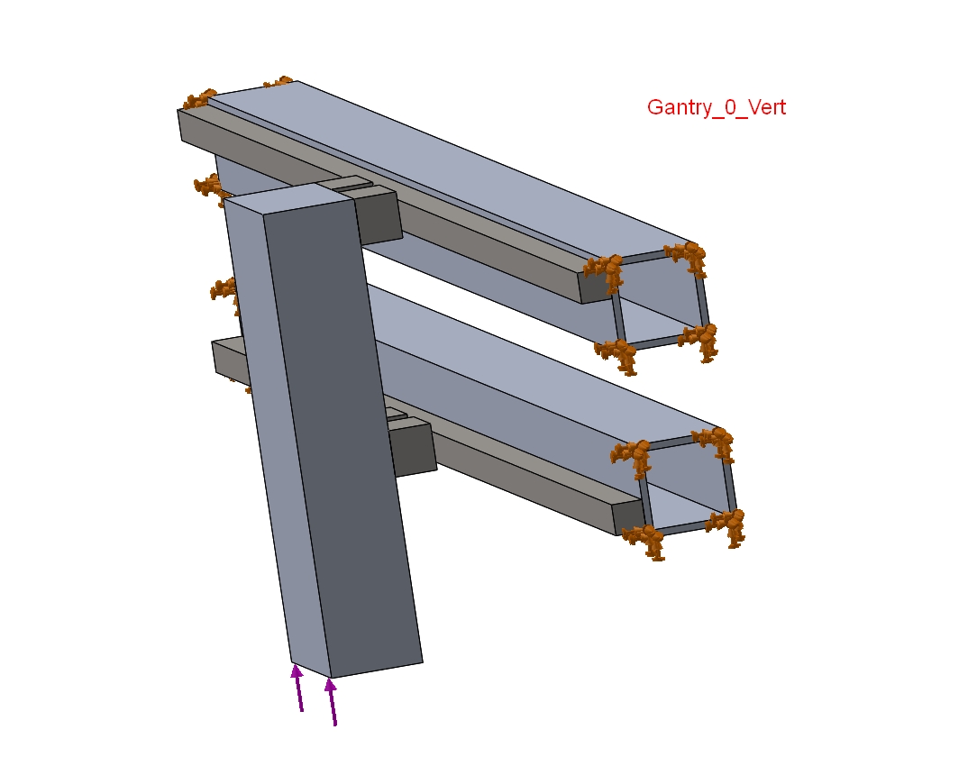 I inverted the legs of the "L" gantry configuration and reran the loads. As before the images are respectively, Geometry, Loadcase, Results, and another view of results. Deflection decreased from configuration Gantry_4 of 0.034mm to 0.030mm for Gantry_5.