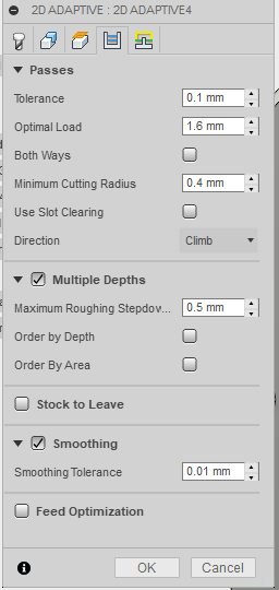 Yeah so I would reduce that optimal load down to something around 0.8mm and increase your maximum step down to the tool diameter to start with (so 4mm here). This will engage more of the cutter length but reduce the amount it's trying to move into the part on each pass. The way you have it set up currently it's the bottom 0.5mm of the tool that will be doing all the cutting and you'll wear it out much more quickly.