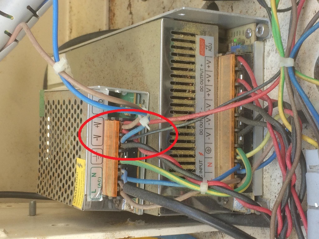 Yes Geoff, PSU = power supply unit. It will be the small one in this picture and test the V++ V-- highlighted in pic. The PSU will probably have sticker telling you the voltage Output. 12 or 24Vdc