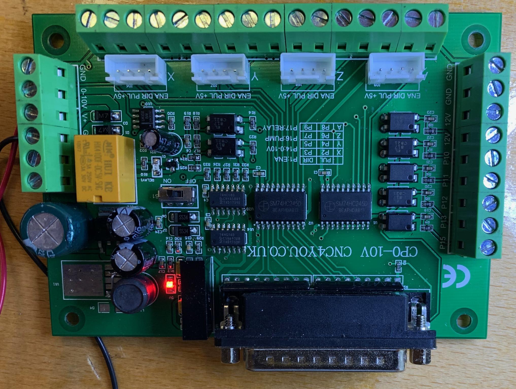 Not a good picture, but shows that the power LED is now on. I've tested all digital outputs to the axis step/dir and ENA pins and relay with/without charge pump. All satisfactory.