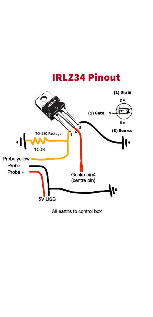 Just be looking at IRLZ34N online John, looks like a great solution. Just not sure how I power the probe, does it need to be from the Gecko's 48v supply and if so what is the best way to achieve this? If its ok to run it off a 5v USB supply or a 12v wall wart and do I need to connect the earths of the two supplies?