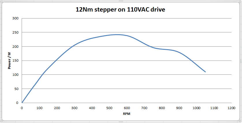 I've only got the motor on 70V (DM860 drive), so that graph isn't ideal, but it seems to work well and runs the spindle up to 2000rpm. The motor was fine with drilling a 6mm hole in aluminium and general turning. I think I'll make a bigger pulley for the motor and try it anyway. The finish leaves a bit to be desired, but I think that's mainly the lathe itself being weak and having to have the material quite far from the chuck as currently the rear shaft on the motor interferes with the saddle. I don't think that will be a problem with the longer belt and if it is I can easily mill a little bit off the steel block I attached to the saddle to get clearance.