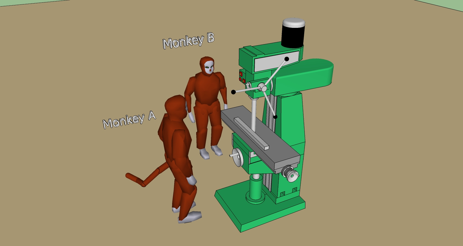 The sketch shows the two operators standing next to the machine, Monkey B has bigger balls than Monkey A and decides to stand at the end of the table in the 'danger zone'. Monkey A puts a 4mm cut on a 50mm x 20mm piece of aluminium bar and starts a climb milling cut.