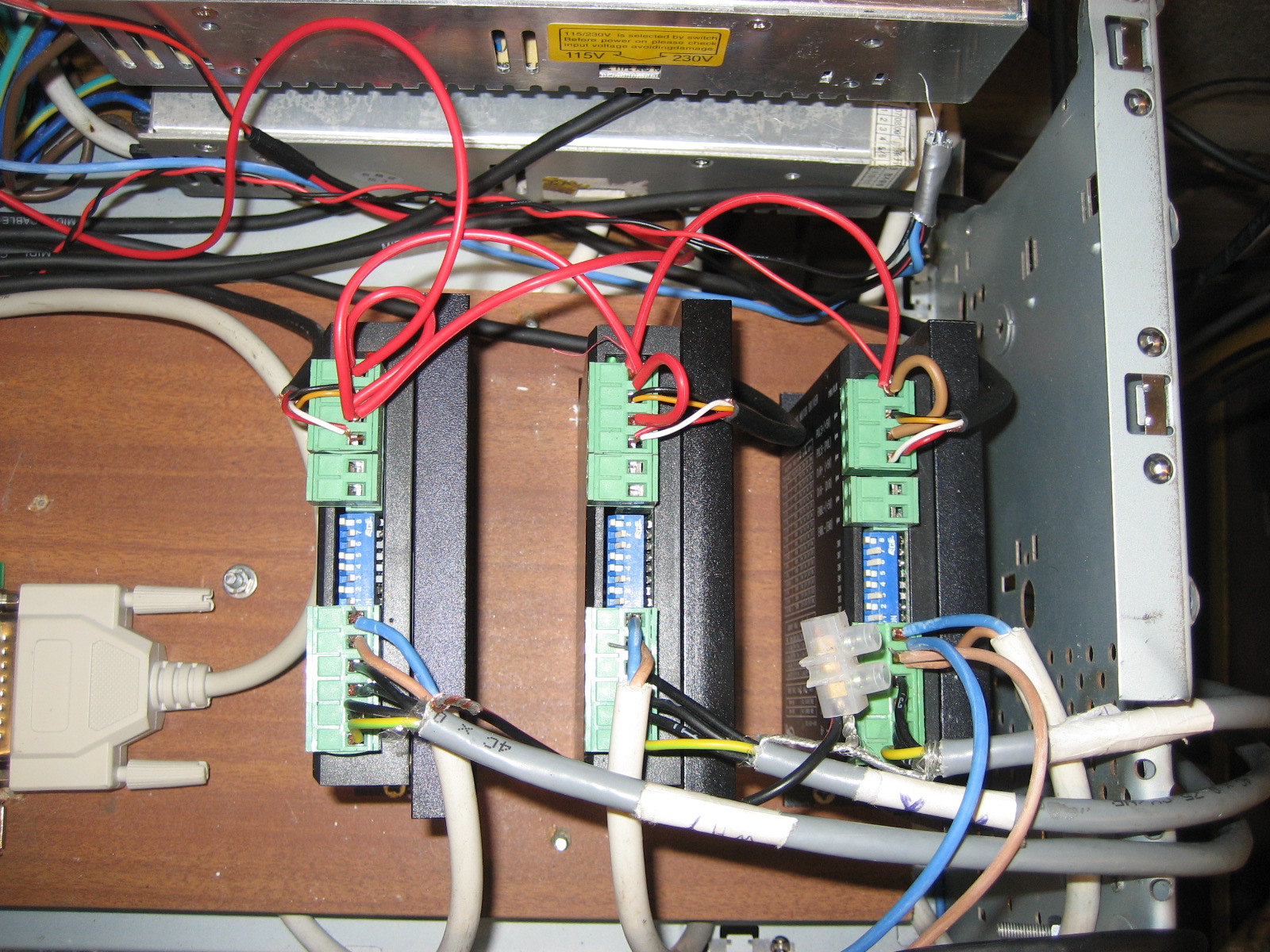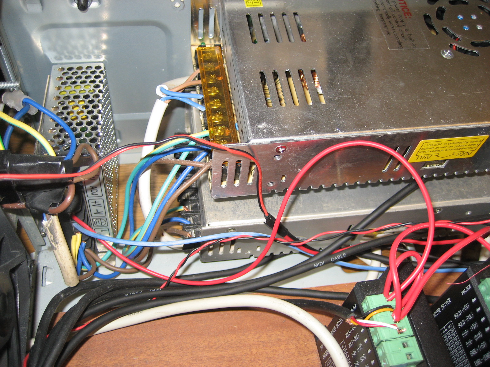 Looking at your control box wiring, the main power supply to the drives should not be daisy chained. The diagram on the Gecko site at http://www.geckodrive.com/support/st...ly-basics.html shows how they should be connected. If connecting everything to the power supply is not practical, run short wires from the power supply to a star terminal, then run the wires to the drives from there. For the star terminals, a couple suitable mounted/insulated bolts are ideal and just use ring terminals to connect the wires.