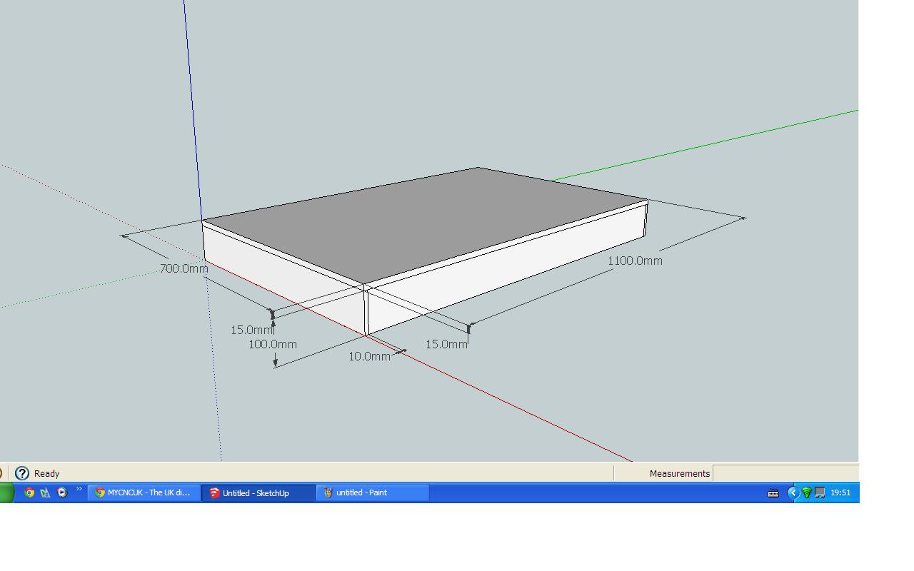 The top is 1100mm x 700mm x 15mm, the sides are 100mm x 10mm as are the braces on the inside. The channel I have left because I'm undecided whether or not to use two steppers for the x-axis or just the one, in all likelihood it will one in the centre