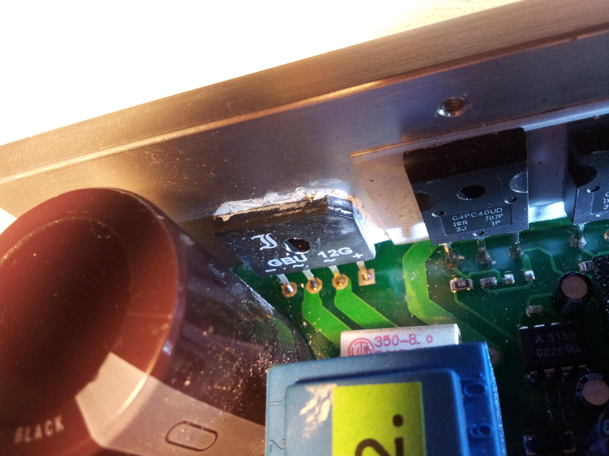 -1- desolder the GBU12G ( was very complicated because of 4 legs to heat together and some kind of rivets clamps fitted on the 4 concerned holes of the board ... long story )