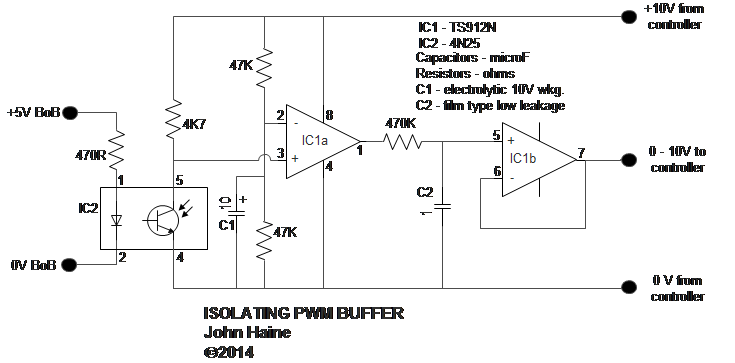 OK, I've sort of been inspired by this thread to work out a simple circuit to interface the PWM from a BoB to a non-mains-isolated speed controller such as the Sprint or KE type thyristor units. This circuit does not need an auxiliary power supply, it runs from the 10v available from the controller itself. It uses an ST Micro dual "rail-to-rail" op amp to hopefully get the full 10V control range. It isn't tested yet but offered just as an example, but I think it should work.