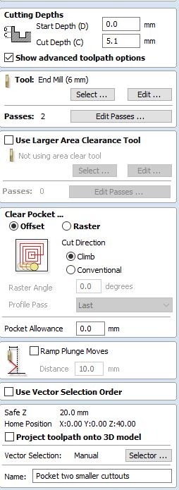 In the attached picture the blue line indicates the pocketing path and red line profile cut path.
