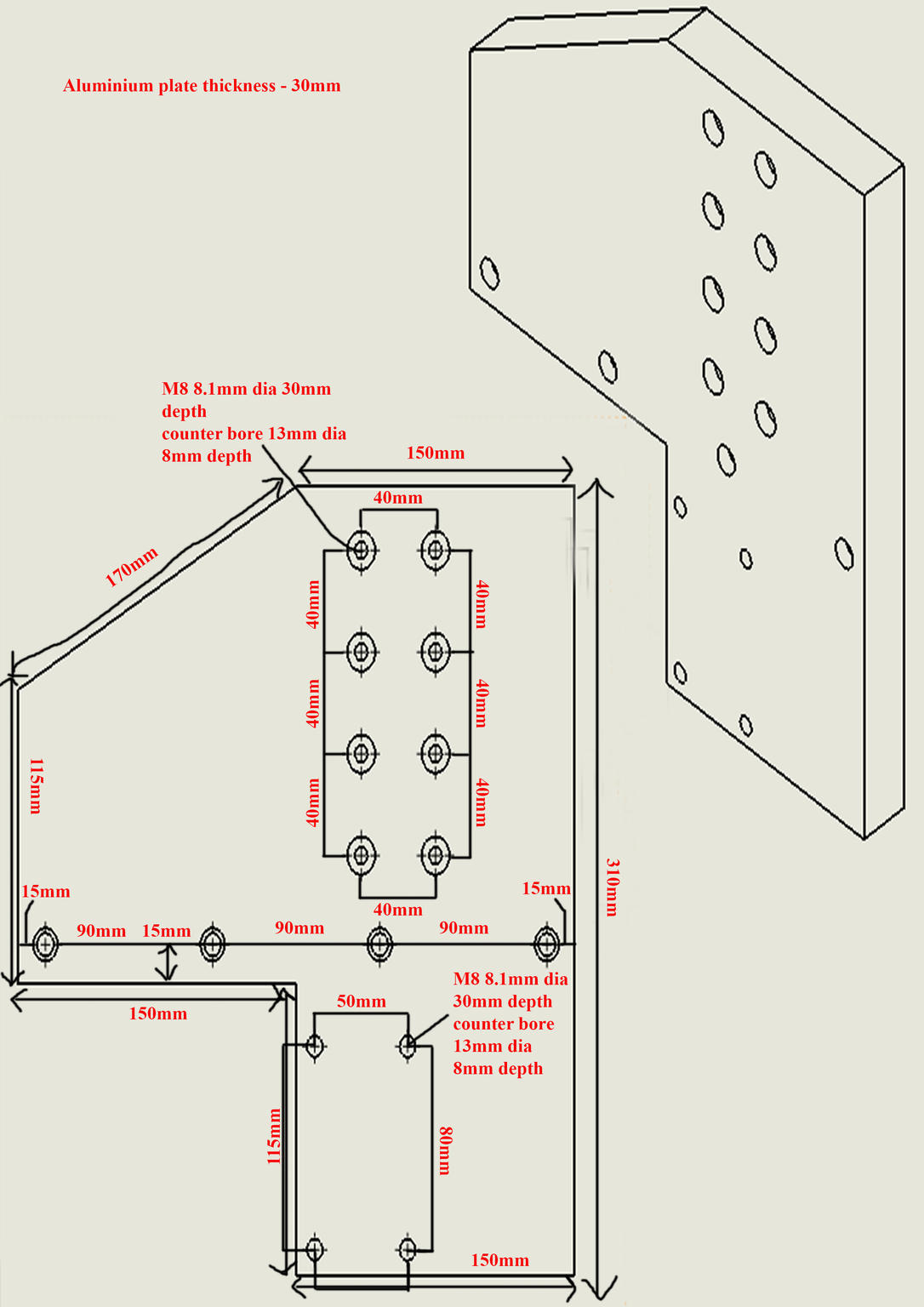 Just to add to what Clive says, I don't see any measurement for the actual position of the 4 and 8 grouped holes on the plate, try and pick two sides(Datums) to take the measurements from and maybe positional tolerances if its important to you. Also you don't need the length of the angled side, an angle would do.