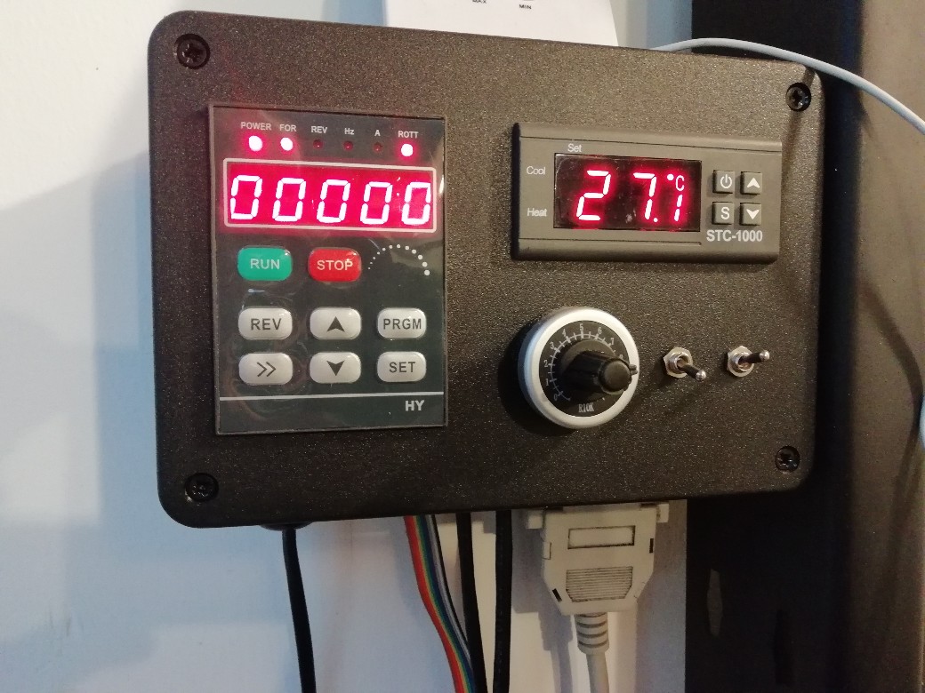 I bought a long ribbon cable extension for the VFD control panel and I have a manual potentiometer that I can switch to if I want to overide the commands from WinPCNC. Also included is a temperature controller which controls 4 PC fans that are mounted on a van heater matrix and the water flow is supplied by a fish tank pump. That's the LPT2 cable that you can see and then the internal electronics are tapped from that.