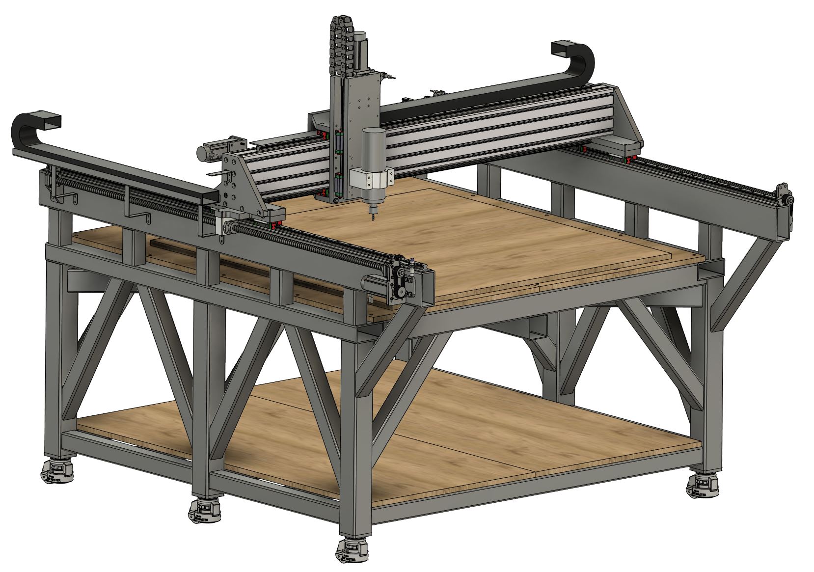 I think I'm finally there with the design, still need to finalise the motor choice and sort out some sort of levelling feet - can't decide whether to add levelling casters, they're pretty expensive but probably worth the money if I ever need to move the machine. At the minute I've just got M12 nuts welded on to the base of each leg - they look a little small to me but it seems M12 feet are good for 1000kg each - should be enough!