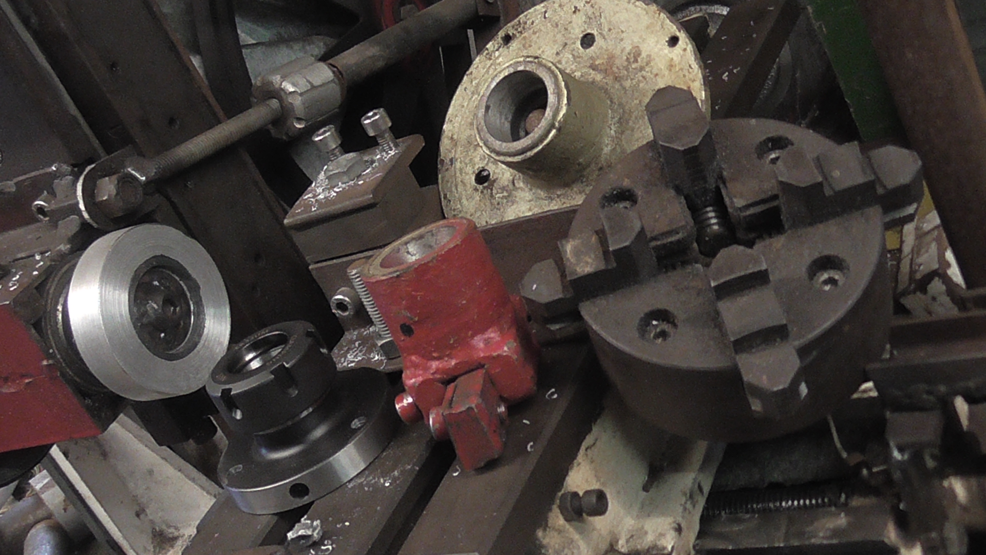 I have made lots of bits for the big mill jncluding a 4 jaw chuck fitting. faceplate , fly cutter. The overarm is not yet perfected. I wanted to do in line boring. The spindle has a taper which fits into the chuck and faceplate with a central bolt and tapped hole down the middle. These bits are made from old trailer hubs whose central hole has been filled with molten aly and then machined to a taper. I made a tool post for lathe tool out of cast iron block.