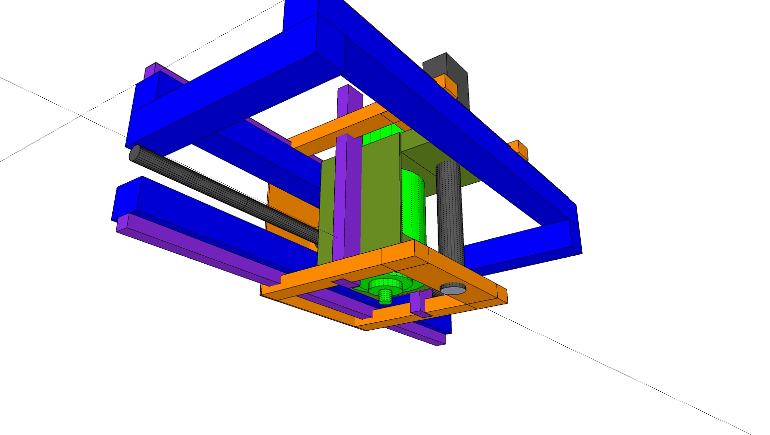 I've left out some of the elements so it can be seen easily. (like the colums parralell to the Z ballscrew joining the upper and lower Y axis motion, joining the upper and lower blue box sections etc.) and I've shown as bars things that could be plate etc. The purple areas are the supported rail, any other questions just shout. If you want to play with the Sketchup file PM me and I'll send it over as Google wont let me upload it, they must have standards! lol.