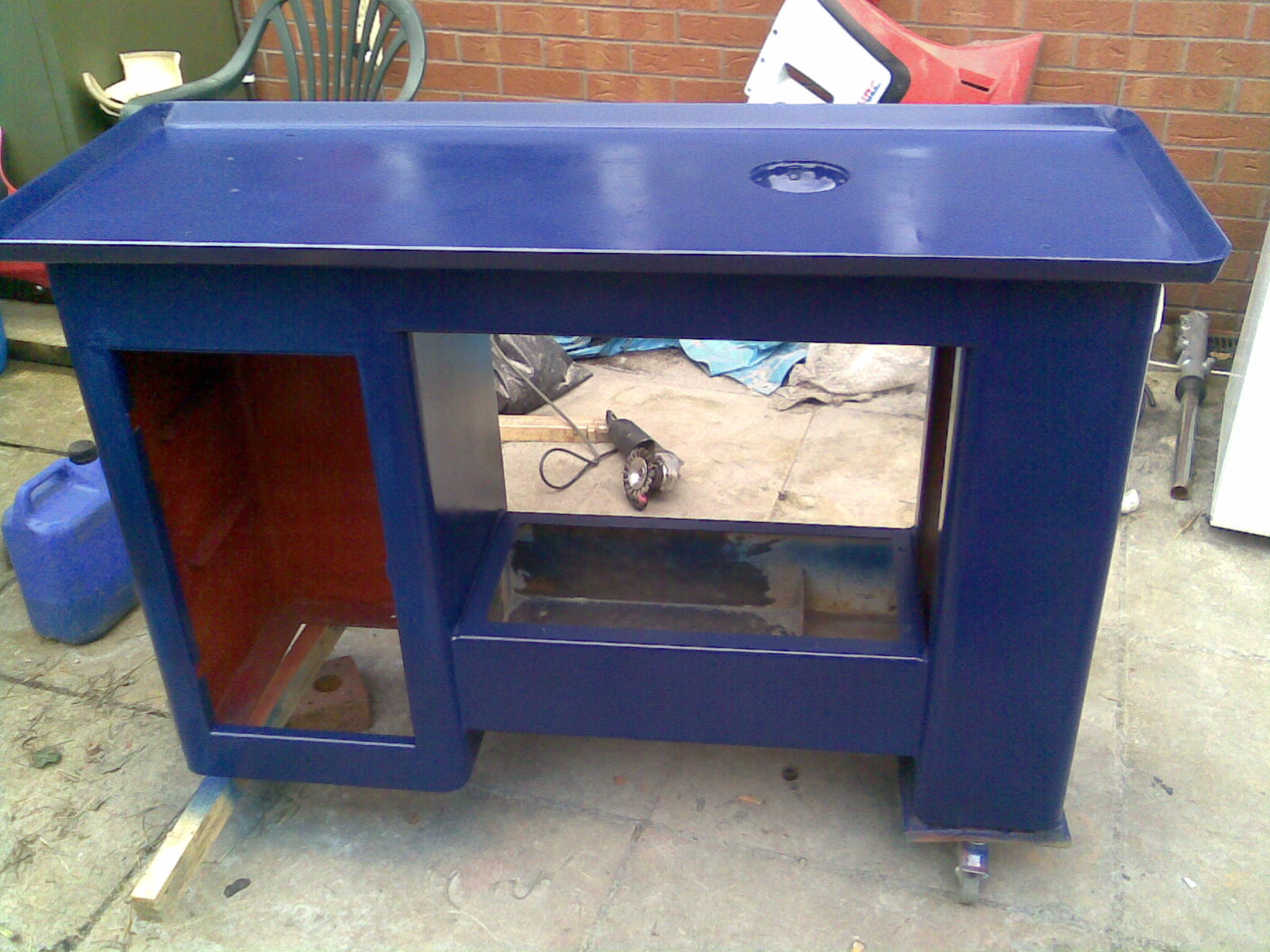made a bit of progress today, finished striping the cabinet, sanded it back and then gave it a proper coat of red oxide primer. then i used the high build primer.