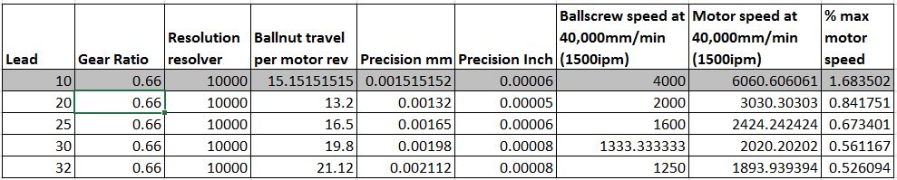 Alright new table now that I got the gearing correct the ballscrew and motor speeds were correct but I took the ballnut travel per motor rev the wrong way.