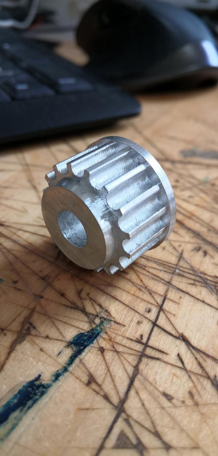 I needed an HTD5 pulley for a project, this was a bit odd as it needed to be fixed to a spinning bearing housing rather than to a shaft so I decided to make one on the machine. I used the cambam trochoidal plugin for the roughing allowing the entire part to be milled with a 3mm endmill, took a bit longer but meant no tool change. Part was cut dry with air to clear chips, worked out really well.