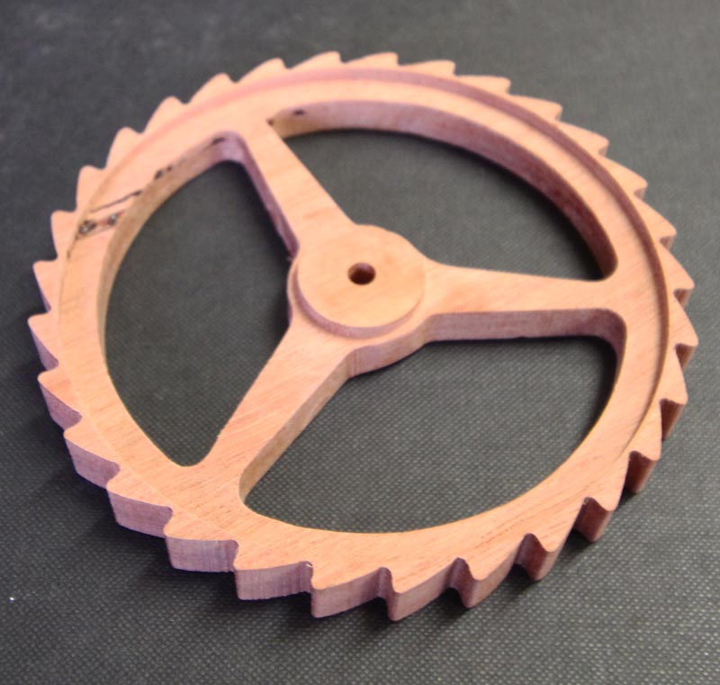 Yesterday I used the CamBam trochoidal pocket plugin to cut out the teeth for a ratchet made from Jarrah hardwood. Conventional shallow cuts tend to take the corners off the teeth where the grain is tangential to the wheel so being able to do a 12mm depth of cut with a 2mm diameter tool is a bonus. I still had to redraw the original ratchet design (produced in Gearotic which will also draw HTD and many other pulleys for you) with rounded teeth to avoid some chipping. This cut used a two-flute straight cutter with a speed of 1000mm/min and a stepover of 0.15 (0.3mm) and the maximum 24000 rpm. This took about 25 minutes for the 110mm diameter wheel.