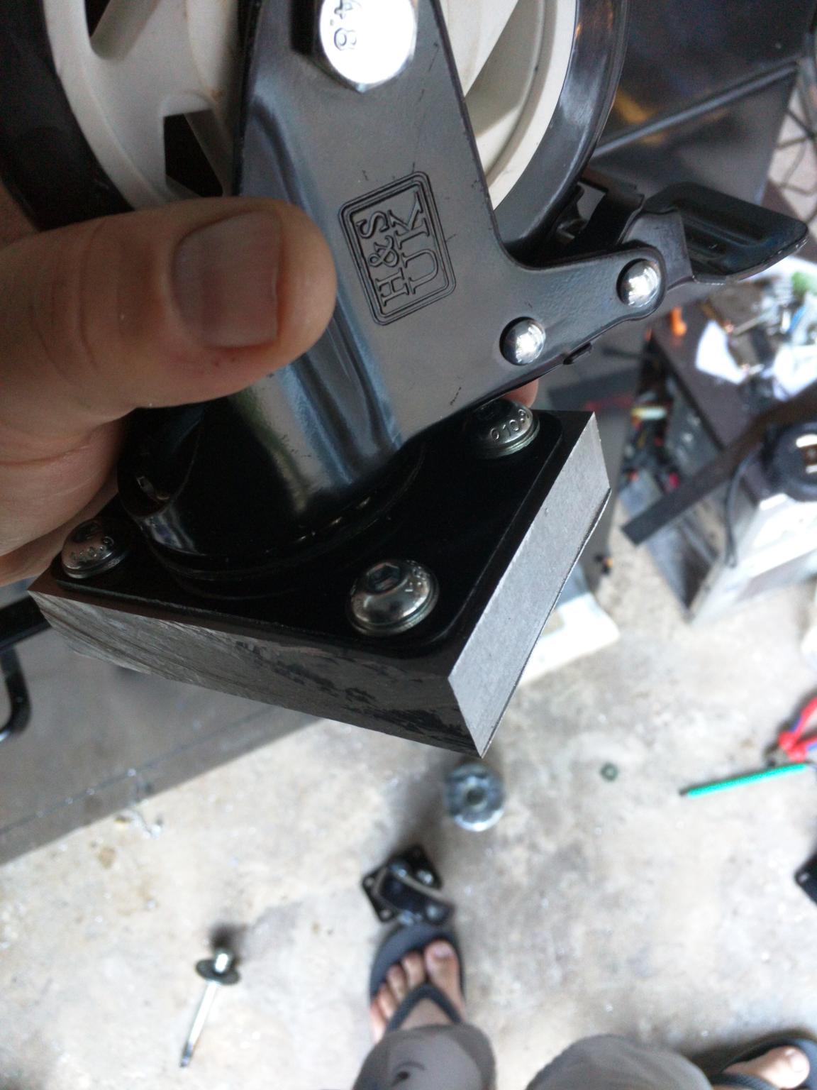 Needed to move the mill but no method available. The engine hoist I bought isnt wide enough. Got an idea to buy some heavy duty castor wheels. Tried to fit them but the metal I wanted to put them on was too flimsy. Came up with a good plan, had some 20mm Alu plate for something else but milled myself 4 plates to basically mate the wheels to the load bearing beams, using the original shafts.
