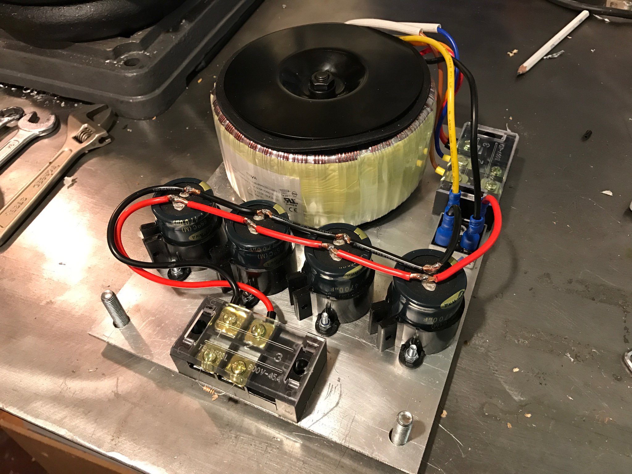 On Joe's he's connected the red & orange together, blue and brown are going to the mains, then he only has yellow and black (1 primary core I guess) which he has going at diagonal across the rectifier. I didn't really get what was going on how Joe has it wired but what you said is how I thought it should work ;)