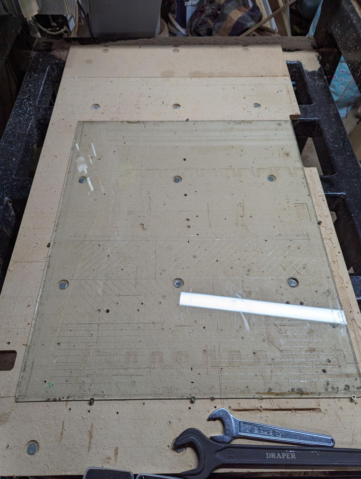 Amazing use for your cnc router - never thought about cutting plate glass using CNC. I have a big slab of 10mm float glass that I use for tramming the spindle on my machine because it is relatively flat. My machine is currently in its transport cradle since December 2021 when I moved house. Getting the garage sorted out now and just need 4 burly guys to help me lift it into position...