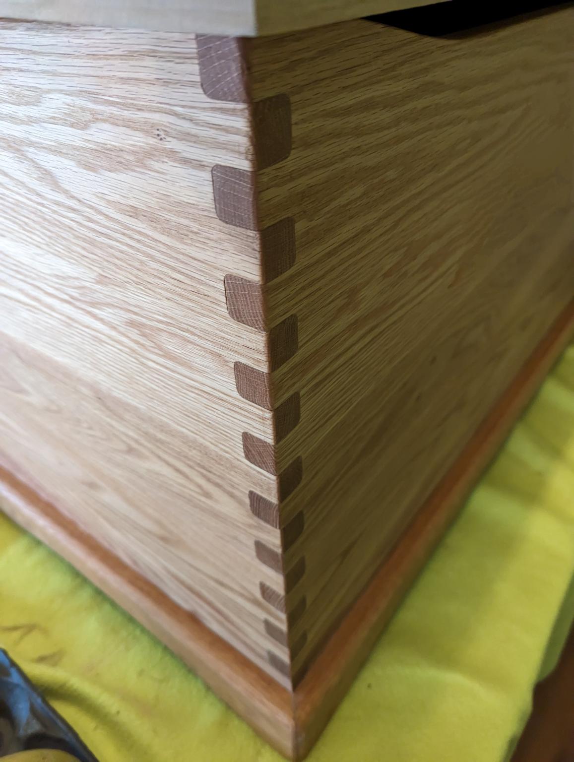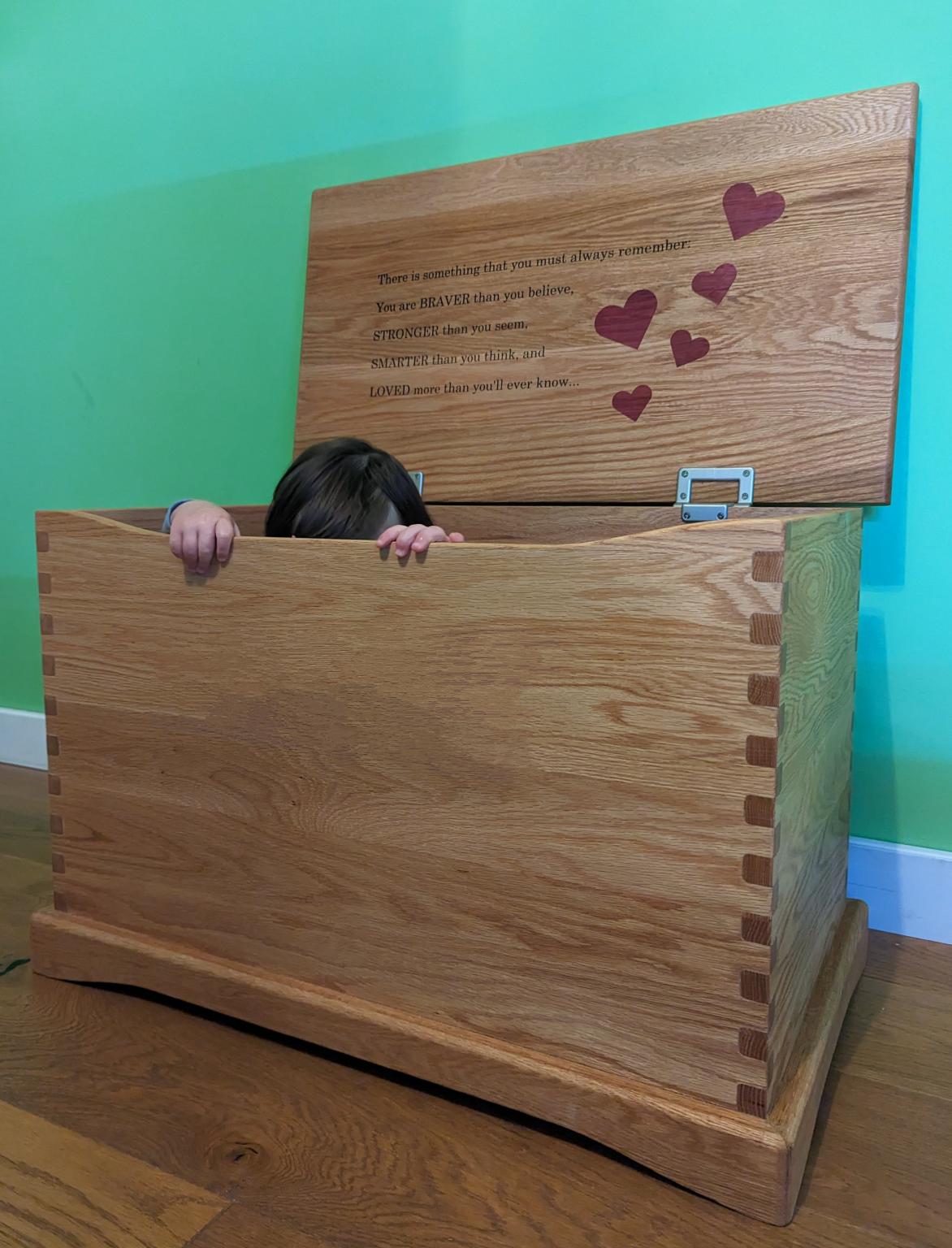 I saw the solid oak toy boxes from makemesomethingspecial - and was utterly obsessed. I had to make one, and now I have an excuse to have a toy box around... So off I went to find some appropriate oak, and into CAD I went. Here is the result - although again I've removed her name which is carved in the front through the wonder of Google's magic eraser (hasn't it done an amazing job matching the grain?!) - Complete with the box's owner playing peak-a-boo inside. Don't worry for her hands, the hinges are rockler's torsion spring hinges, so the lid stays exactly where its left.