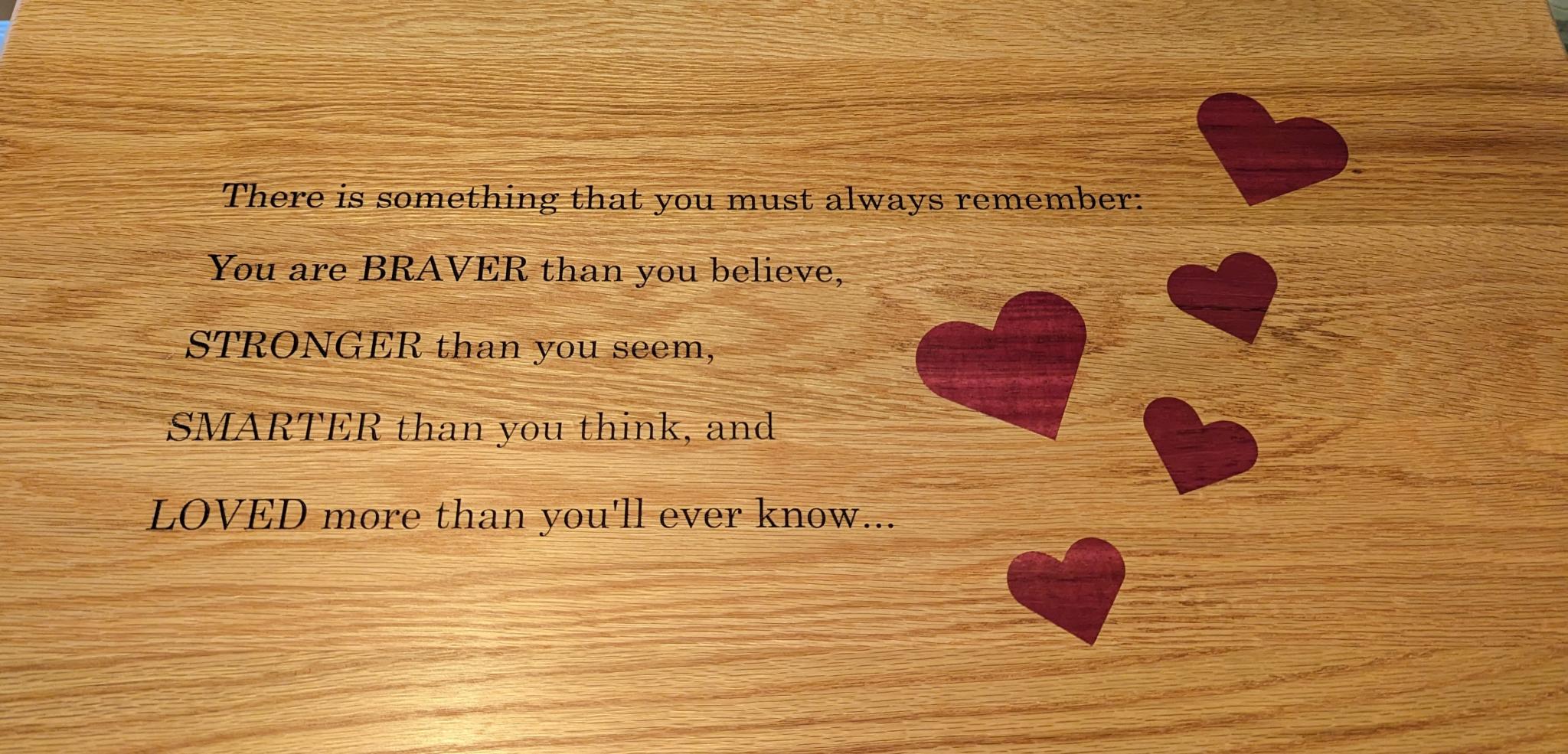 And then of course the lid needed some inlays. I couldn't think of anything better than the Disney Winnie the pooh quote, so I went with that alongside some purple-heart purple hearts. Corny? Yeah. But cute, too.