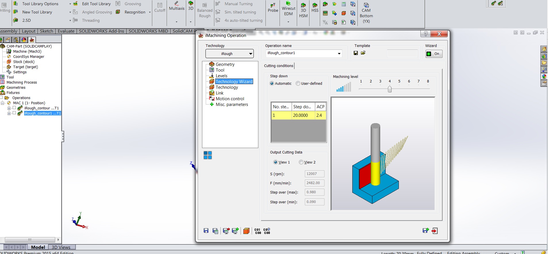 No Using i-machining which is Solid-Cam's version of trochoidal I can cut much more aggressively than 1000mm/min at 20mm DOC. i-machining adjusts the feed based on geometry while it's cutting and usually, it's anywhere between 2000-4000mm/min and 14-18000rpm. And that's on the medium setting 4, if I bump up the level to 7 it really rips chips, but it knocks the hell out the machine and spindle so I keep it between 3-4. This usually spits out feeds between 2-3000mm/min, 12000rpm and varies the step over between 0.1 and 0.9mm. See Pic