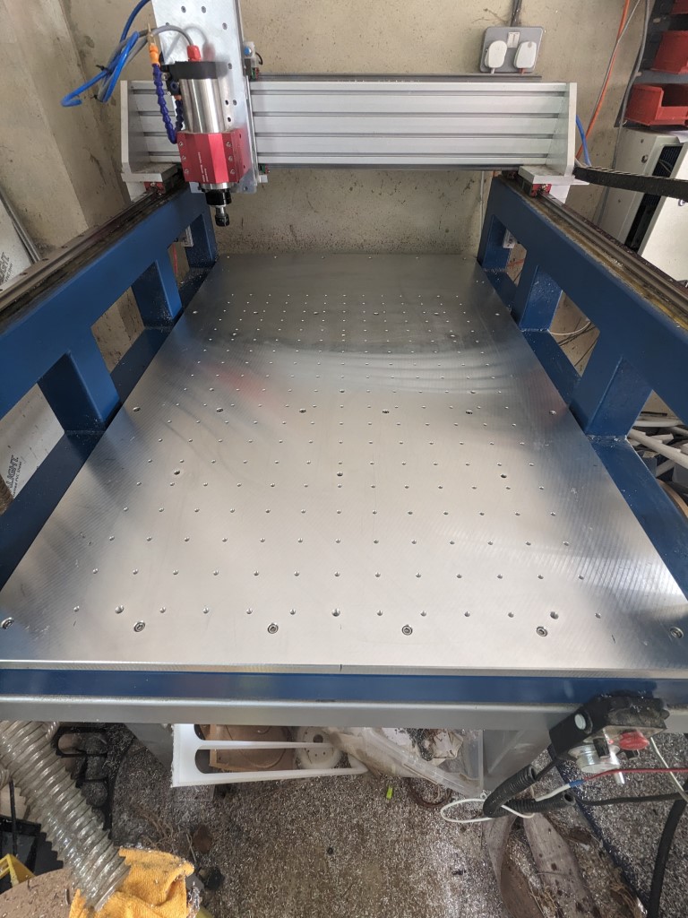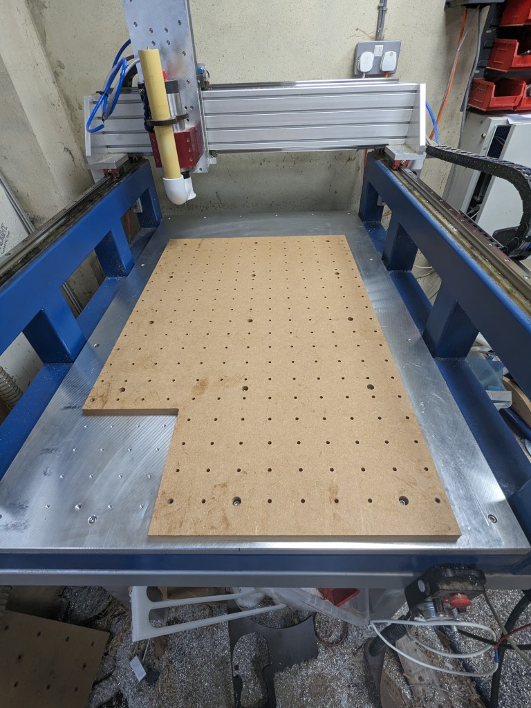 New spoil board machined with thru holes to reach the threaded bed holes. Missing corner is for vice and 4th axis which sit on their own registration plates. Sometimes I need to cut jobs that use the whole bed, when I next need to do one i'll make another spoil board without the missing corner, they only take a few minutes to swap and surface.