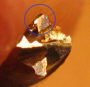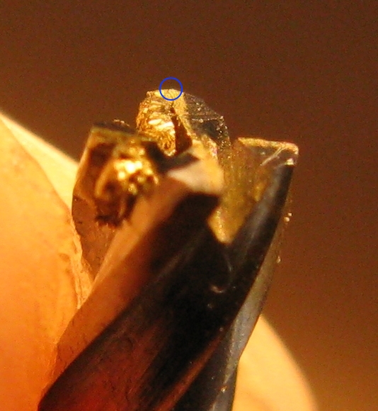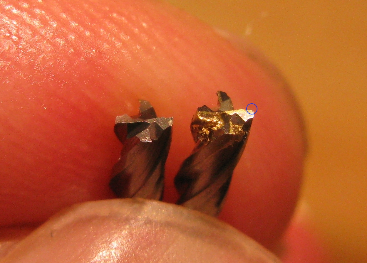 Result: tool snapped off in the middle of the first pass. It looks as though the tips have worn quite quickly and then the tool has become clogged with brass: