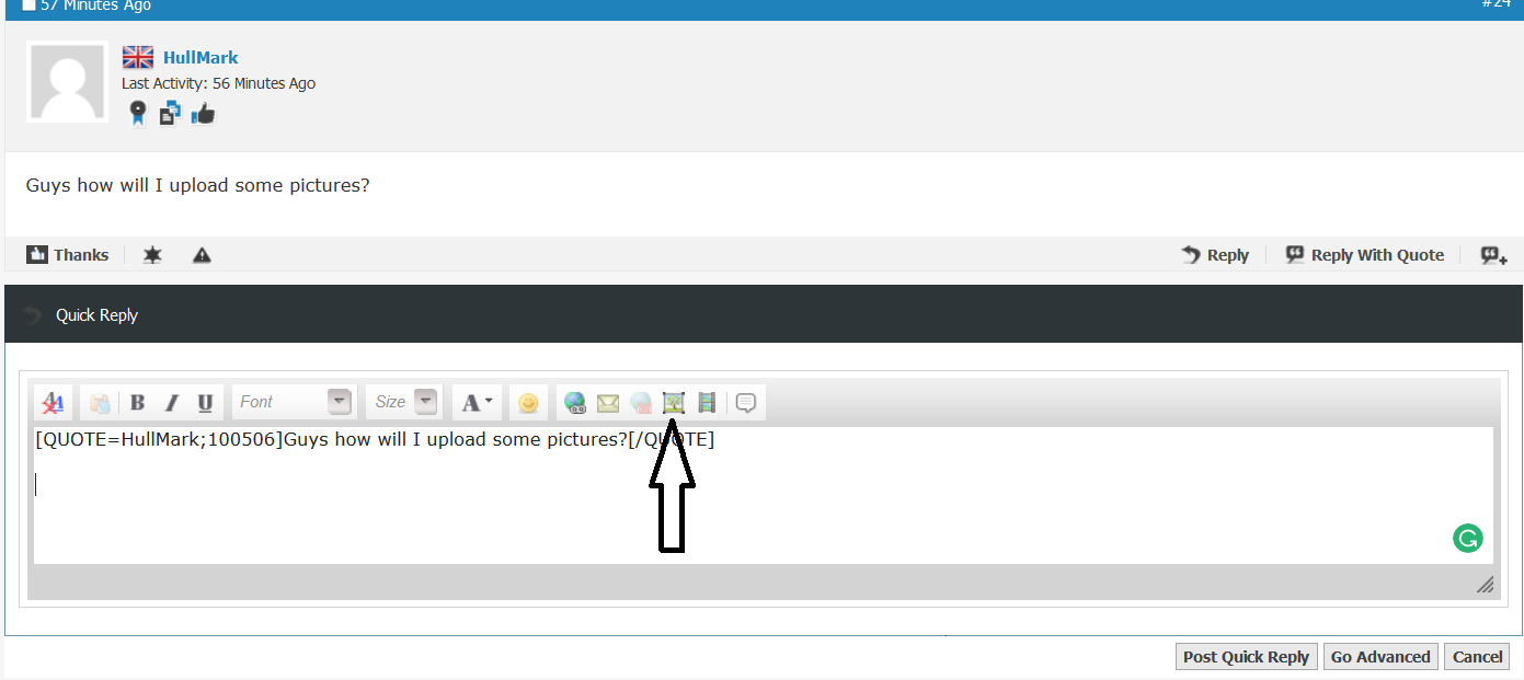 Start post Click on this icon in pic. Then on "From Computer Tab" Then "Browse" select pic then click on "Upload files" writing.