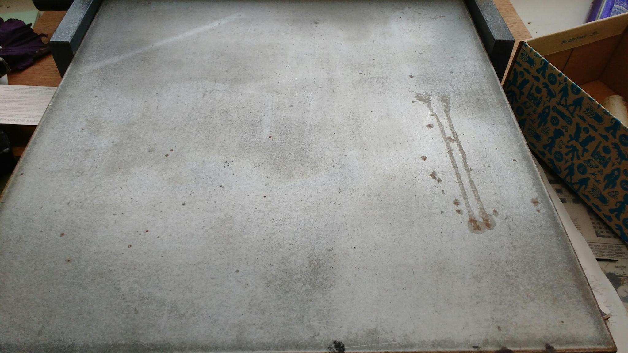 Also had the platen flame-cut and Lumsden ground at a local fabricators. Mild steel, £40 all in. Not sure what to make of it. It's definitely bowed (see pic below) but I haven't been able to get a silver Rizla through the gap (they're around .02mm) - gaps look bigger than they are, I backlit the press with some strong light. I imagine this is something to do with the stock not having been stress relieved prior to grinding... The underside of the plate is working the shoulders of the drive roller a bit, so I might just fit a sheet of 1mm thick vulcanised fibreboard to the underside of the platen. As a material, it's very hard to compress, but should squeeze into that couple of hundredths, I reckon...