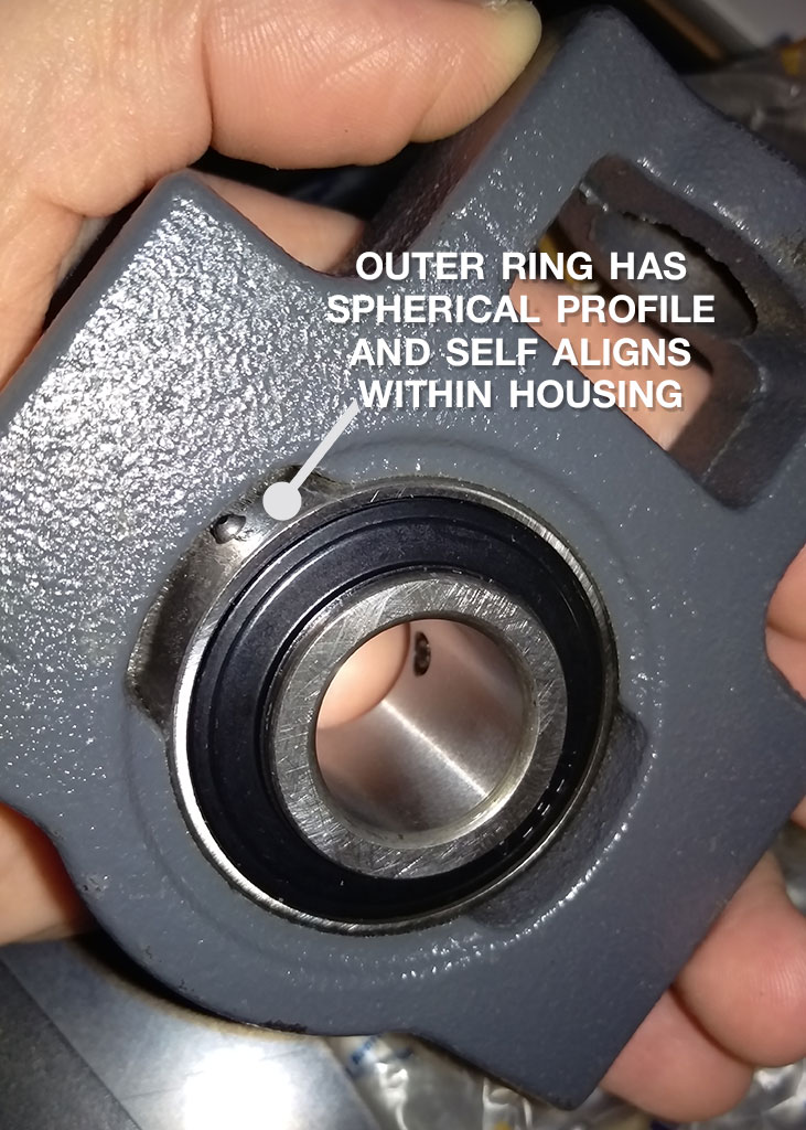 ...Talking of which - my bearings arrived today. Yep - they're self aligning (old-school, not the dual race sort) - the outer ring has a spherical profile which allows it to rotate into position within the housing: