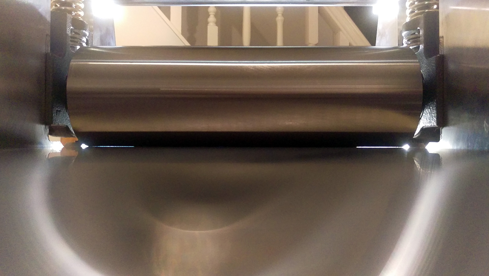 There needs to be a steel platen between the rollers that gets wound across supporting the plate and paper. On the smaller press this is 1/8 inch bit of mild steel plate, on the big one its 3/4 inch by 18 inches by 3 ft or so, a real brute.