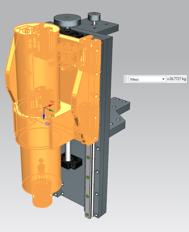 The spindle with Mount + BT30 Collet chuck weighs 19.5Kg. Don't forget if you are using dust extraction then you will need to retract the dust hood to allow access for tool change. This will mean adding pneumatic actuators and solenoid valves along with brackets etc and the dust hood its self.!... The weight creeps up fast.