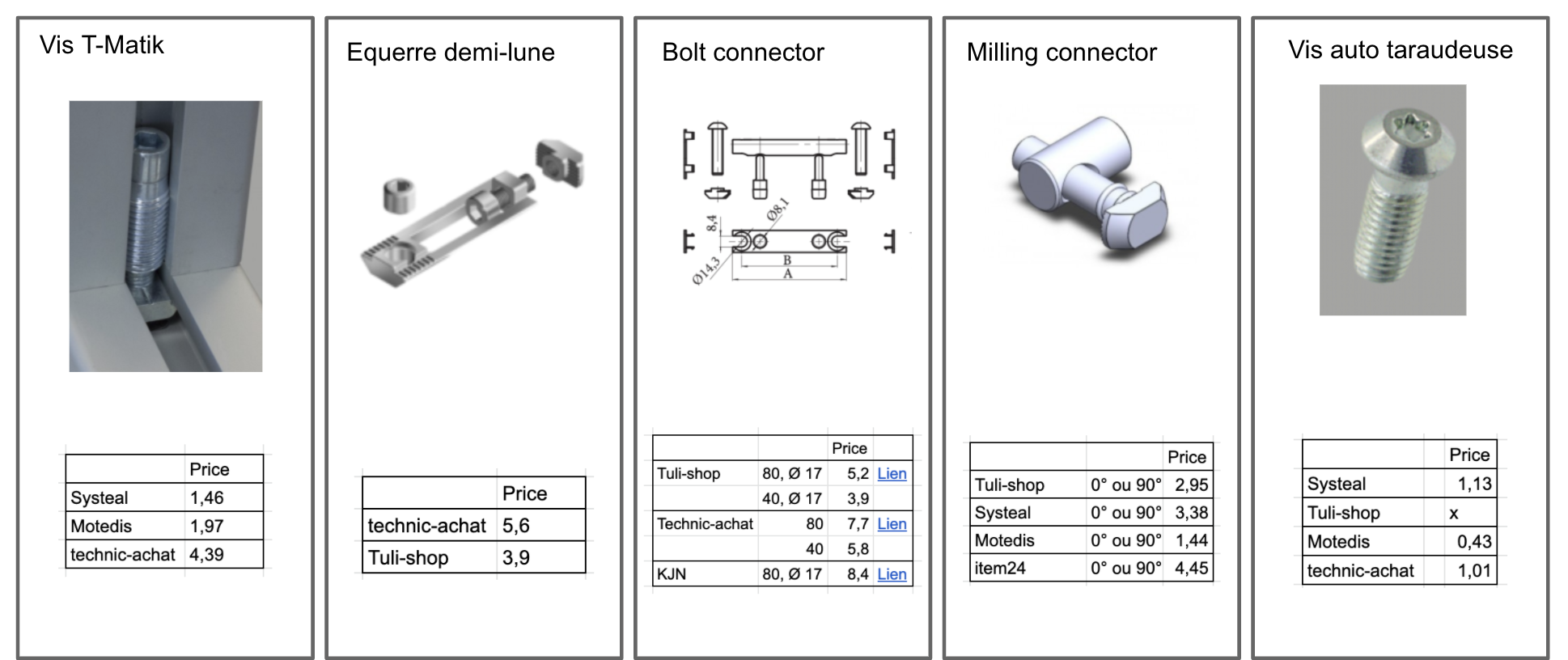 This evening, I make a review of the different 90° connecting option between my aluminium profil (40x80, 80x120 and 90 x 180, all have 10mm slot). In the picture below there is the most commun choice with the price in euros/unit. I don't consider square, I think it is the less stronger connexion.