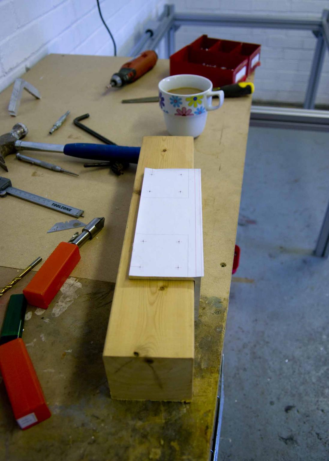 we first (me) with the aid of pritt stick glued the printed templates to the 75x75 angle and then centre punched it, as image 1