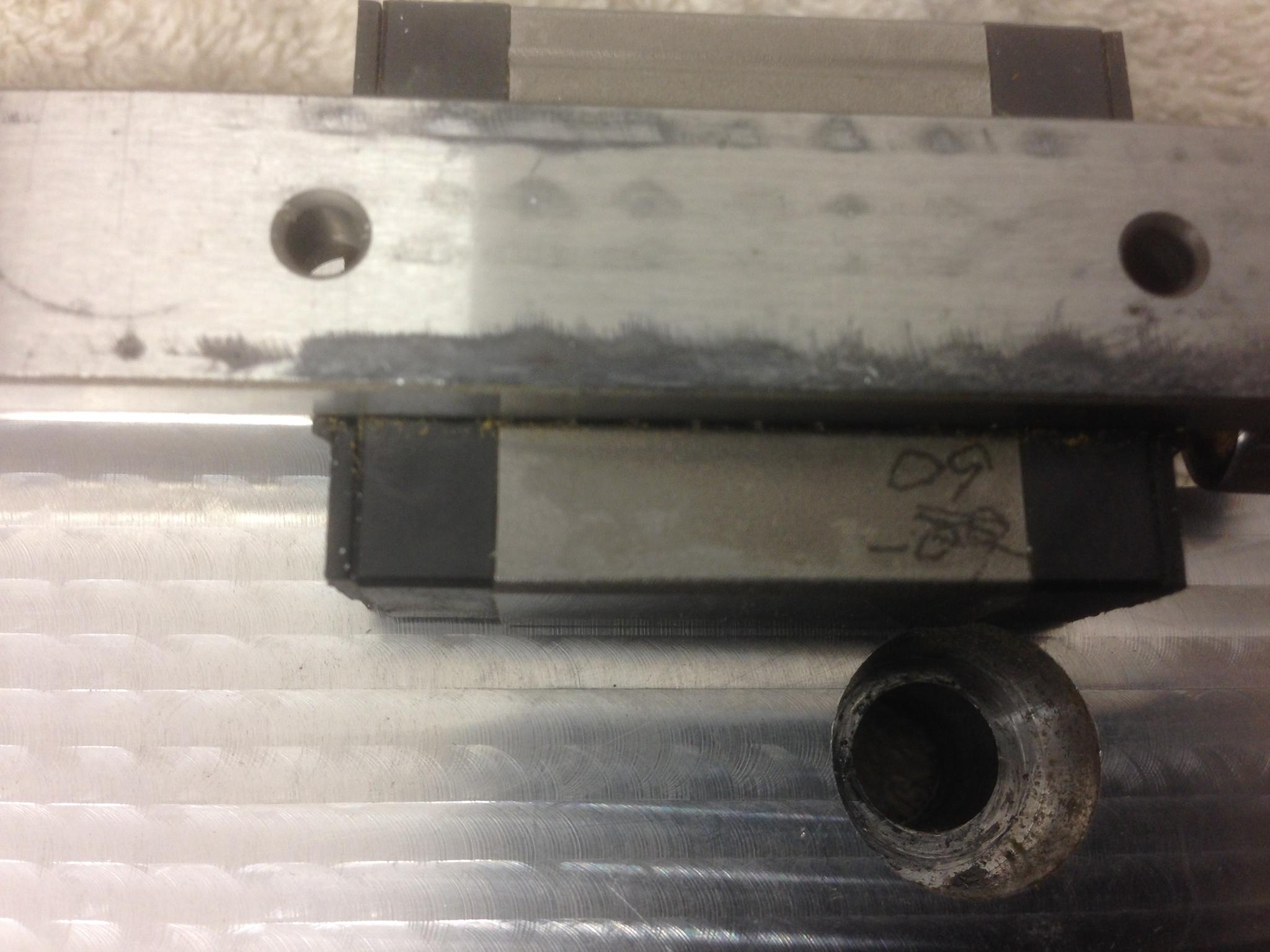 Problem is that the chatter can quickly lead to welding, and with so many parts to make for the new machine it was time to check things out. For info I have been running these 15mm linear profile rails (classed as 15mm minature) for about 5 years on 3 successive machines, and that they were bought as used from 'fa-systems'.