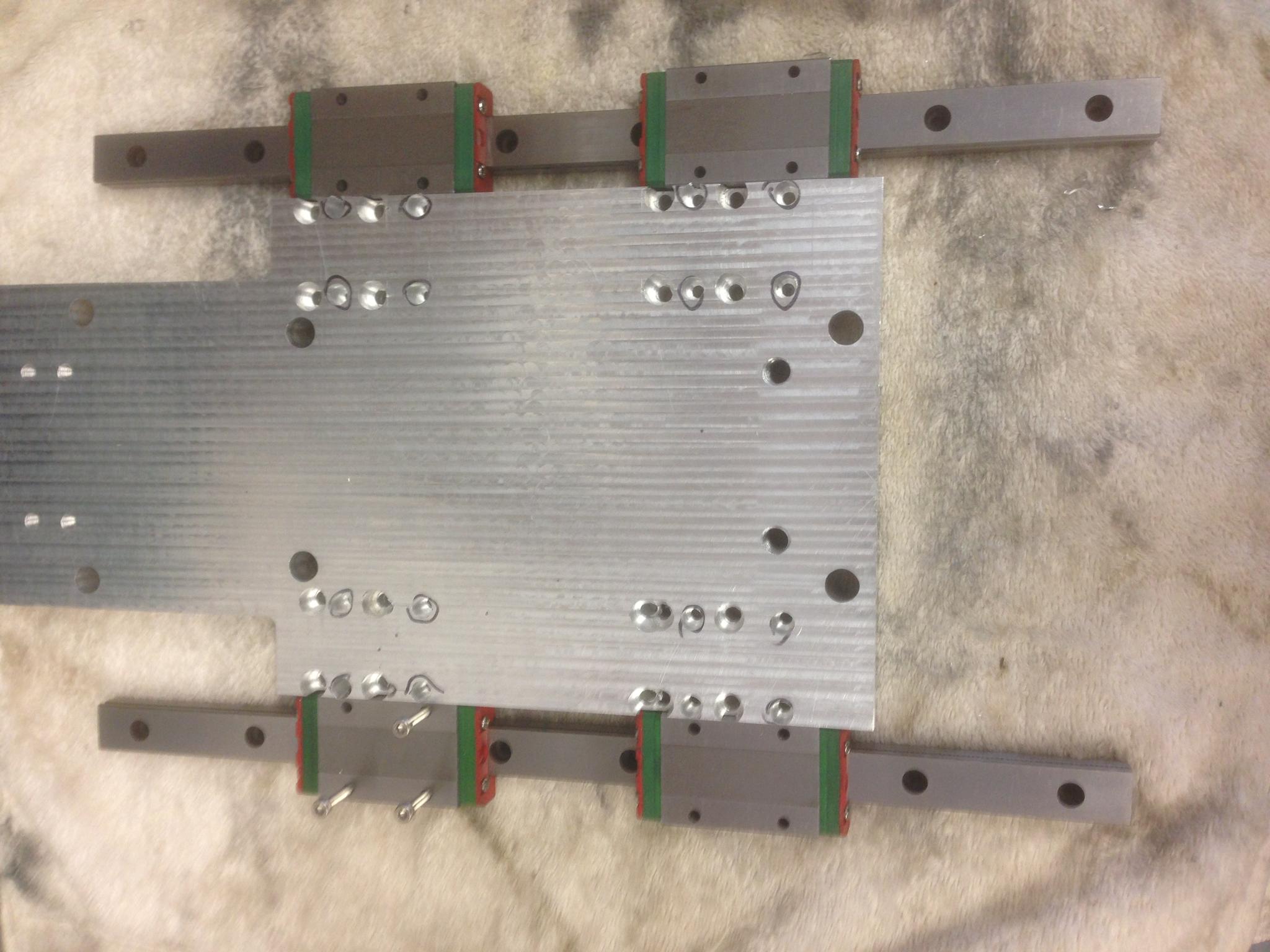 Luckily I had a second set of 15mm rails (new) that I'd ordered for the Z axis on the new mk4 machine. However, the hole spacing was 5mm further apart on the bearing carriages. I ended up drilling another set of 4 holes rather than 2 extra holes because the holes would have been too close to the existing ones: