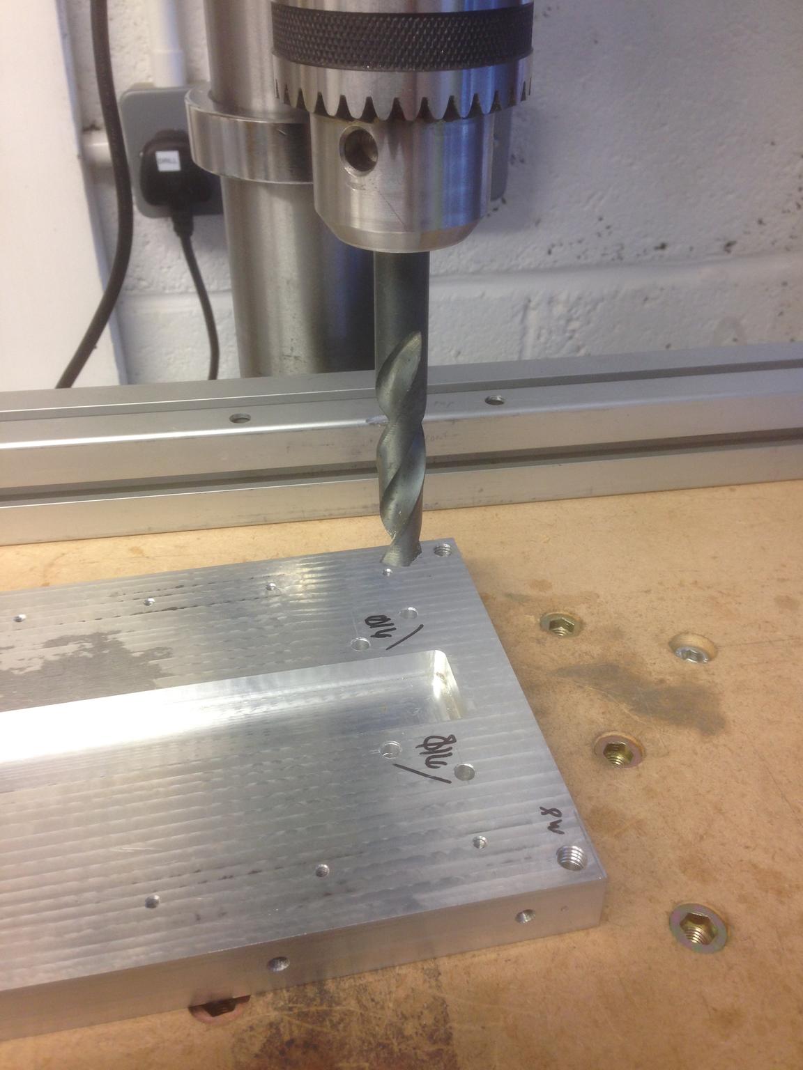The counterbore in each part was a bit nerve racking as it is to take an M8 cap head slightly under flush. This means a depth of 8.1mm in a 10mm part, which leaves just 1.9mm left. Although I had my DRO set on the drill press you still drill them blind and need to trust in the gauge not to go all the way through! I guess I could have used the depth stop nuts as a backup.
