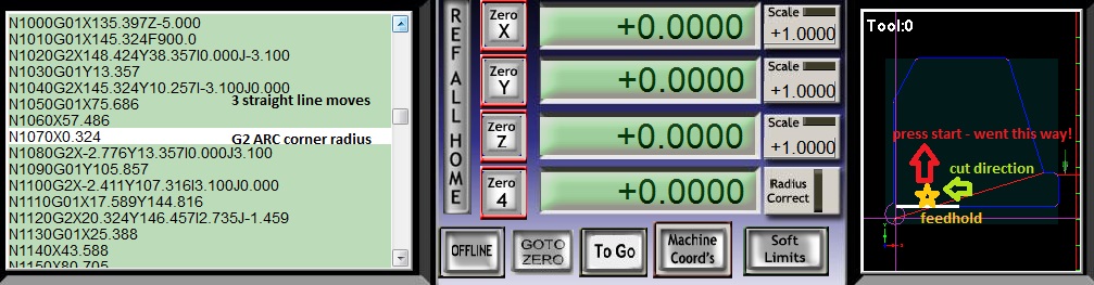 I've read about problems with feedhold in arcs so always feedhold on a straight edge. But I was definitely on the straight bit about half way along the top edge when I pressed feedhold. About line 930. It was some way off getting to the G2 ARC at the corner. When I hit start the machine went up in +Y and snapped the tool clean off.